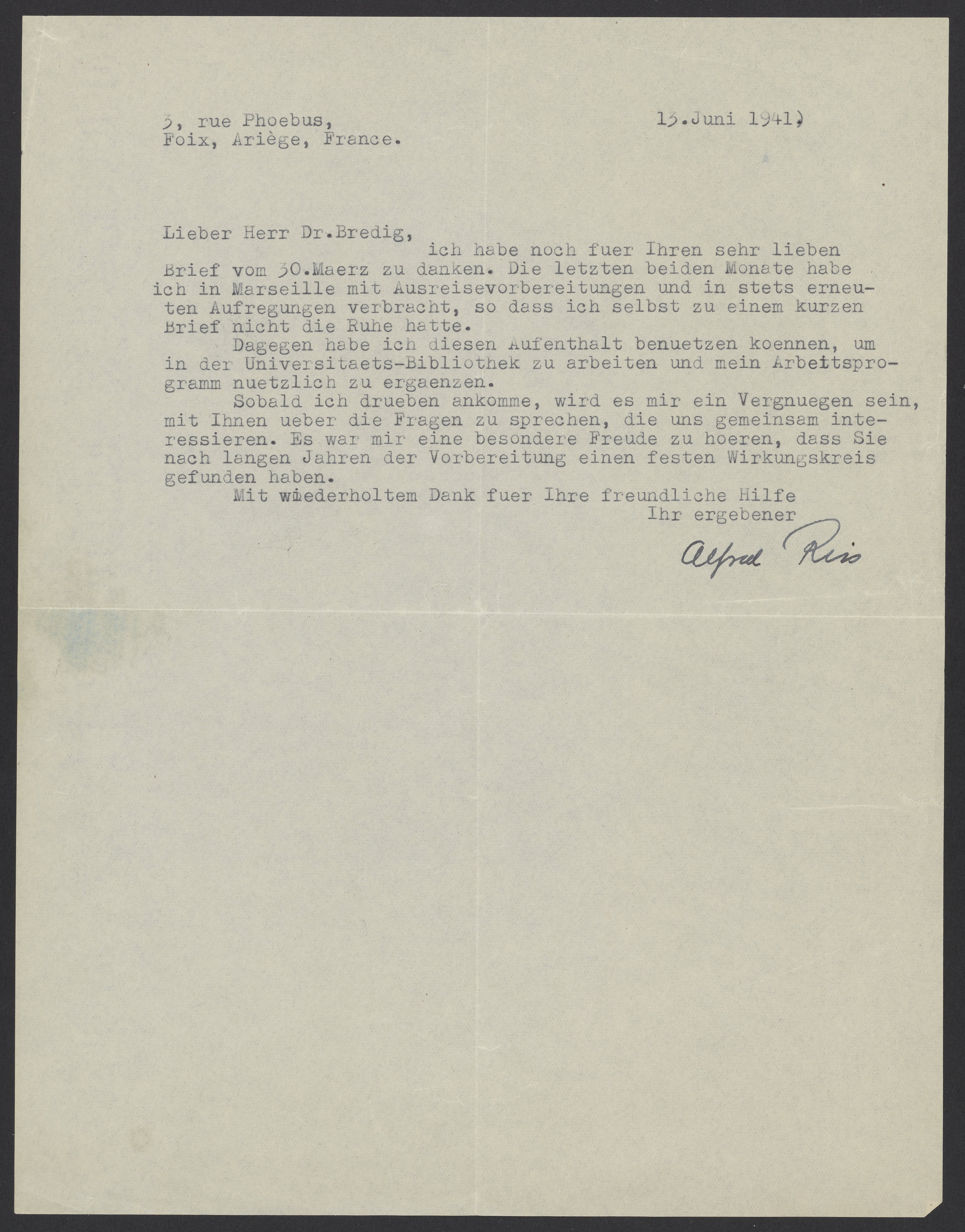 Letter from Alfred Reis to Georg Bredig, June 13, 1941