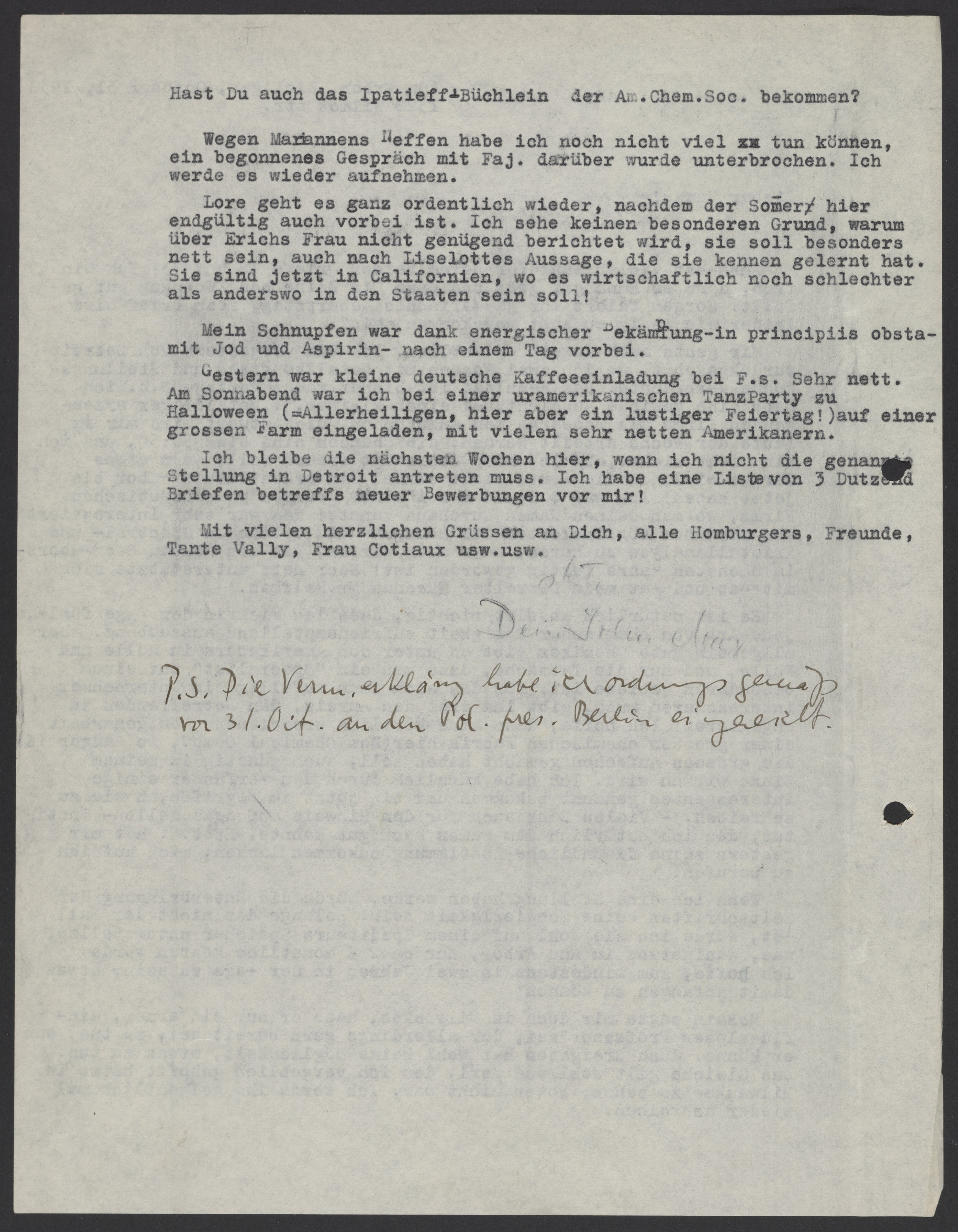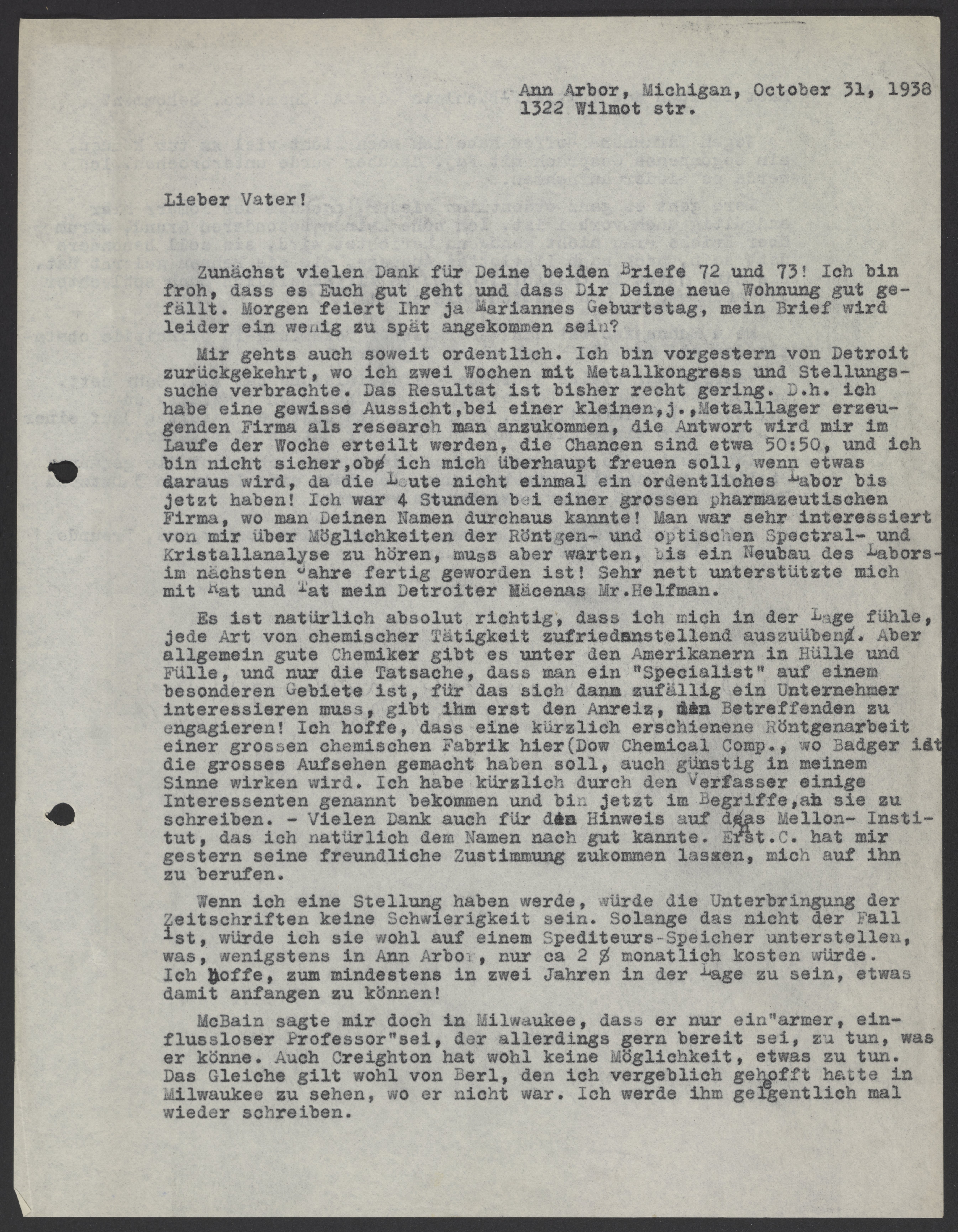 Mir gehts auch soweit ordentlich. Ich bin vorgestern von Detroit zurueckgekehrt, wo ich zwei Wochen mit Metallkongress und Stellungssuche verbrachte. Das Resultat ist bisher recht gering. D.h. ich habe eine gewisse Aussicht, bei einer kleinen, j., Metallager erzeugenden Firma als research man anzukommen, die Antwort wird mir im Laufe der Woche erteilt werden, die Chancen sind etwa 50:50, und ich bin nicht sicher, ob ich mich überhaupt freuen soll, wenn etwas daraus wird, da die Leute nicht einmal ein ordentliches Labor bis jetzt haben! Ich war 4 Stunden bei einer grossen pharmazeutischen Firma, wo man Deinen Namen durchaus kannte! Man war sehr interessiert von mir über Möglichkeiten der Röntgen-und optischen Spectral-und Krisallanalyse zu hören, muss aber warten, bis ein Neubau des Labors im nächsten Jahre fertig geworden ist! Sehr nett unterstützte mich mit Rat und Tat mein Detroiter Mäcenas Mr. Helfman.