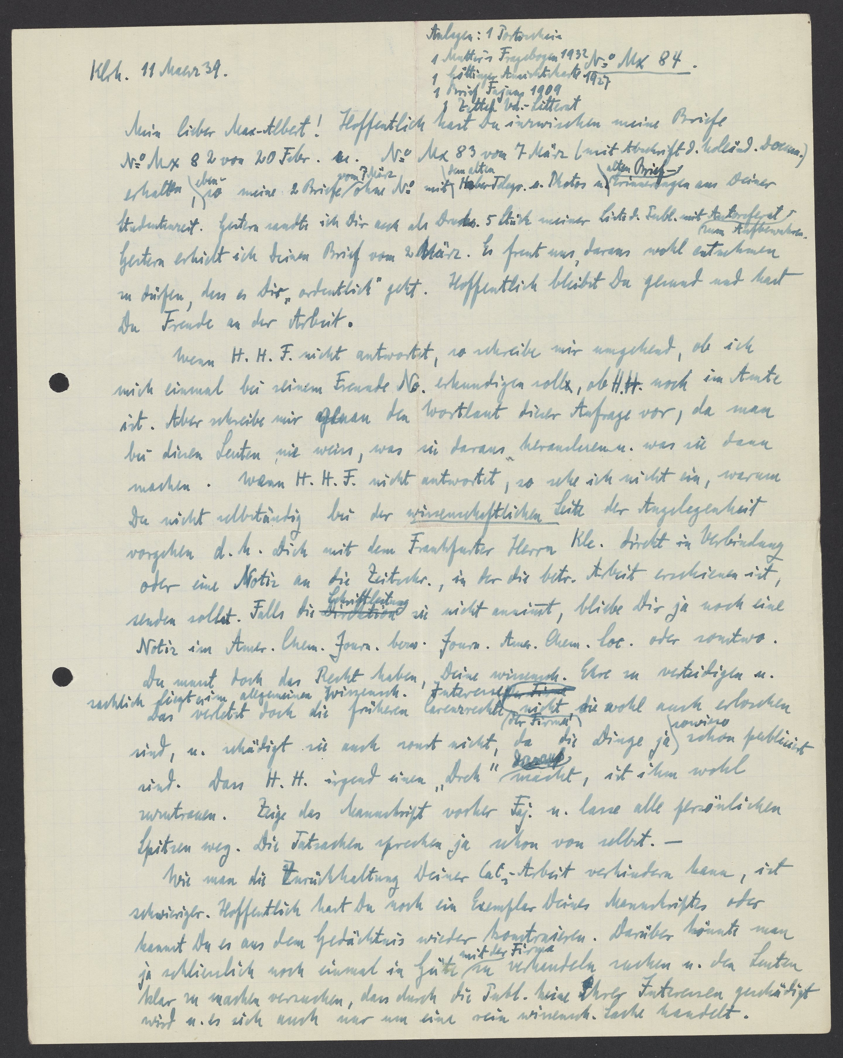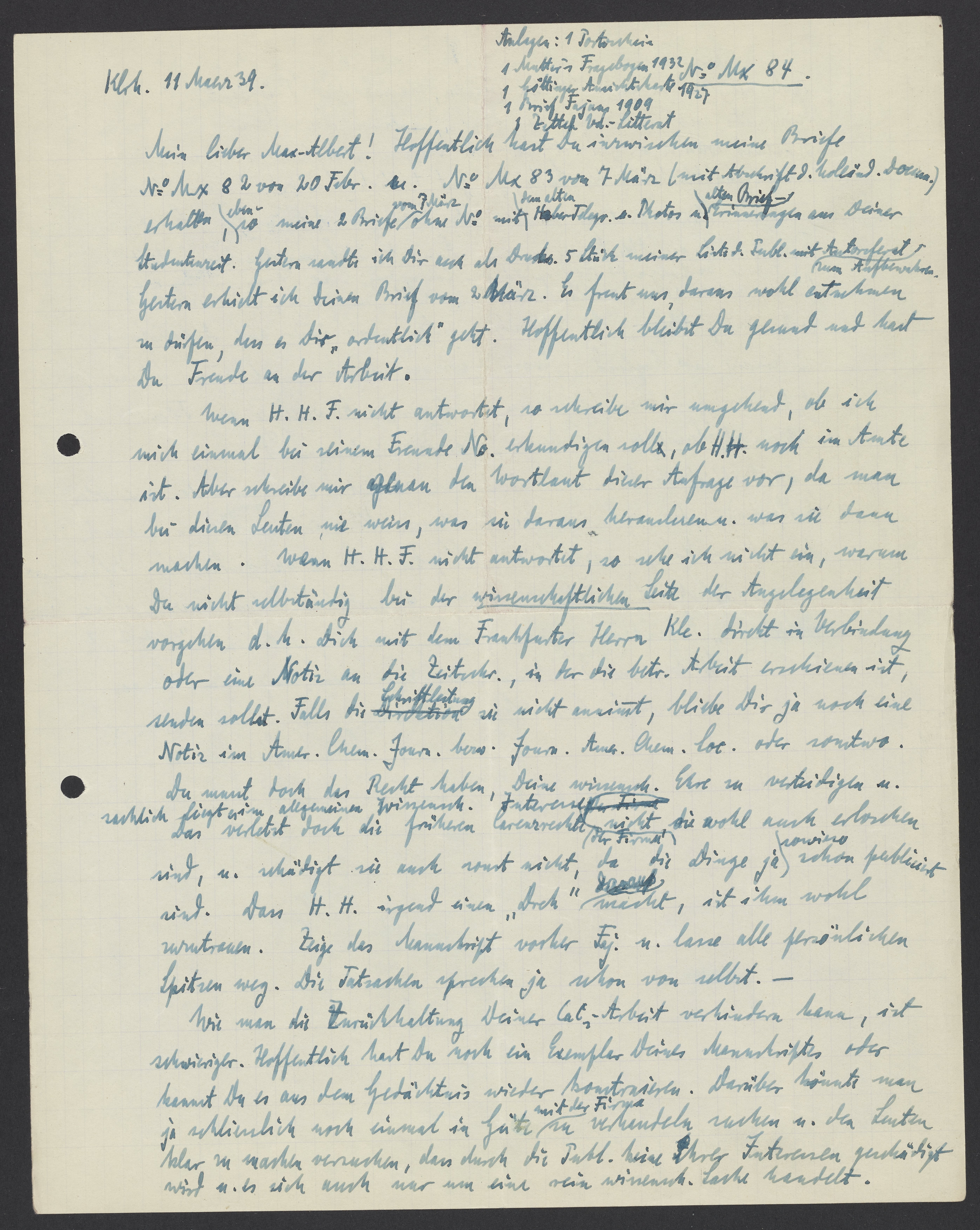 Mein lieber Max Albert! Hoffentlich hast Du inzwischen meine Briefe No Mx 82 vom 20 Febr. u. No Mx 83 von 7 Maerz (mit Abschrift d. holländ. Docum.) erhalten, ebenso meine 2 Briefe vom 7 Maerz ohne No. mit dem alten Haber Telegr. u. Photos u. alten Brieferinnerungen aus Deiner Studentenzeit. Gestern sandte ich Dir auch als Drucks. 5 Stück meiner Liste d. Publ. Mit Autorreferat zum Aufbewahren. Gestern erhielt ich Dein Brief vom 2 Maerz. Es freut uns, daraus wohl entnehmen zu dürfen, dass es Dir „ordentlich“ geht. Hoffentlich bleibst Du gesund und hast Du Freude an der Arbeit.