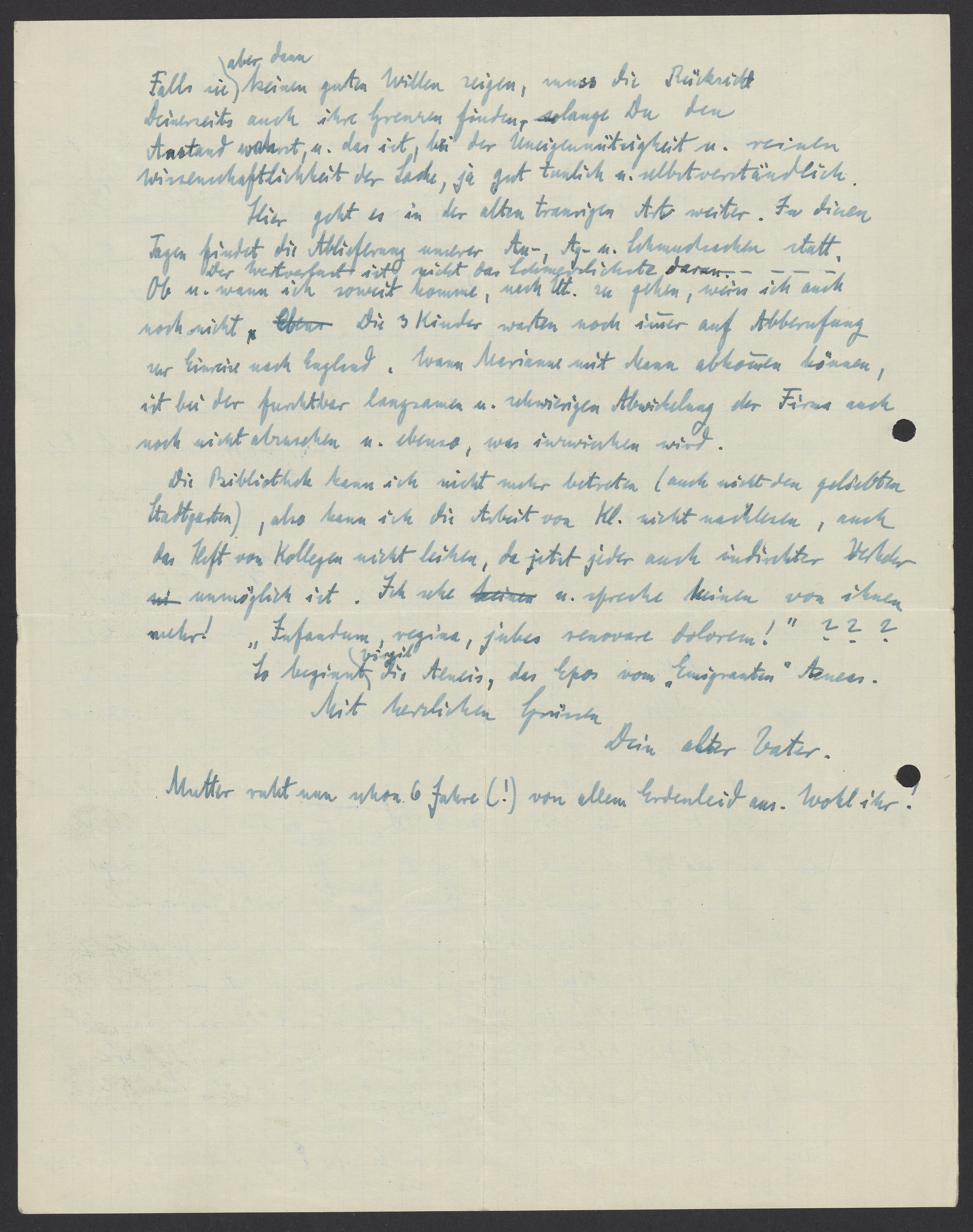 Die Bibliothek kann ich nicht mehr betreten (auch nicht den geliebten Stadtgarten), also kann ich die Arbeit von Kl. nicht nachlesen, auch das Heft von Kollegen nicht leihen, da jetzt jeder auch indirekter Verkehr unmöglich ist. Ich sehe u. spreche keinen von ihnen mehr!