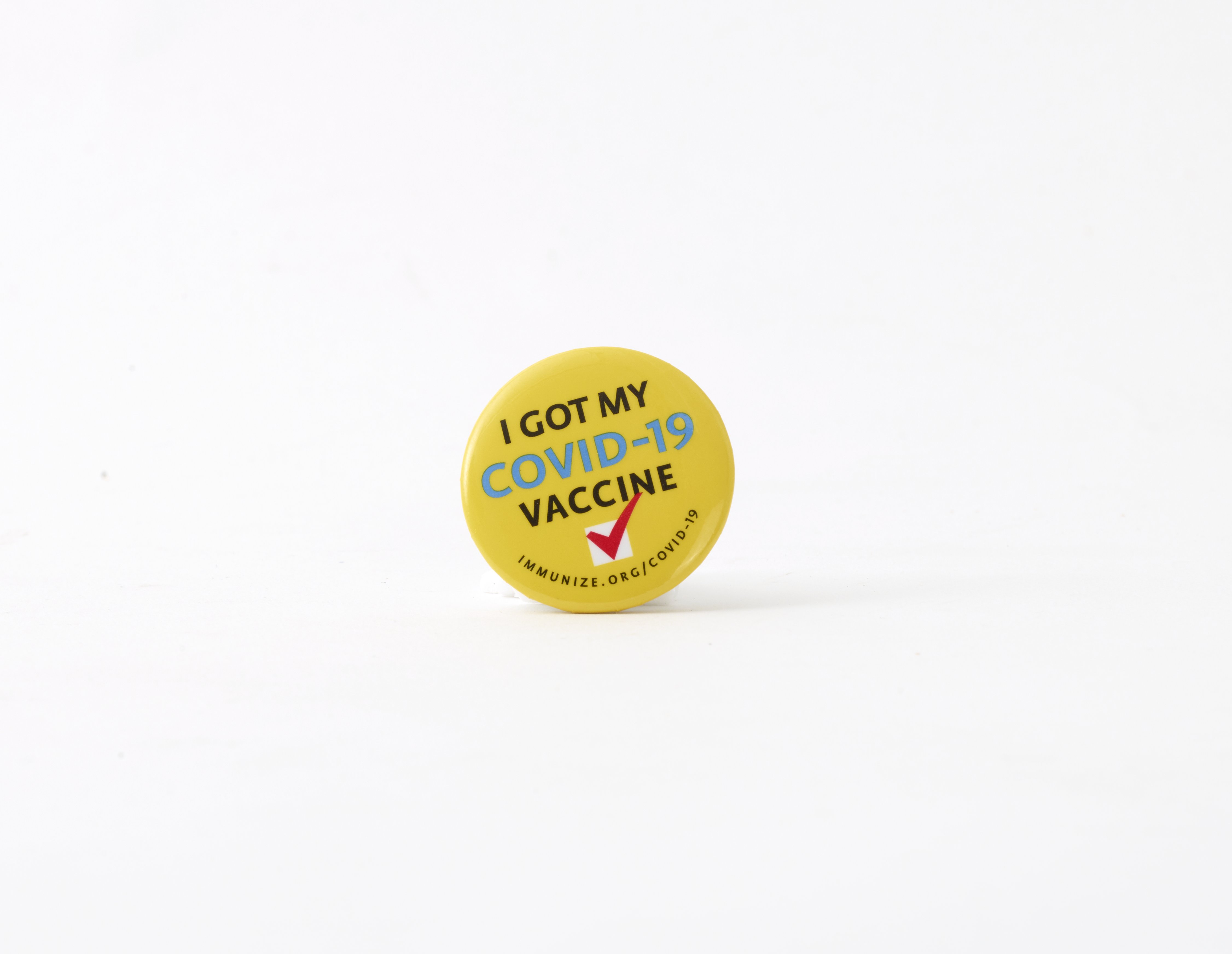 A pin distributed at a mass COVID-19 vaccination site in Montgomery County, PA on April 8, 2021.