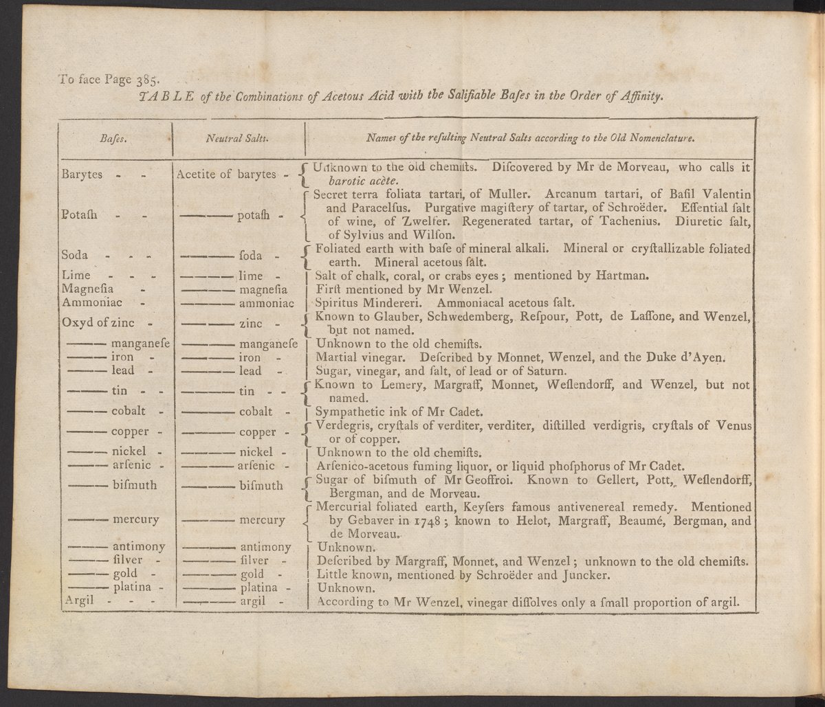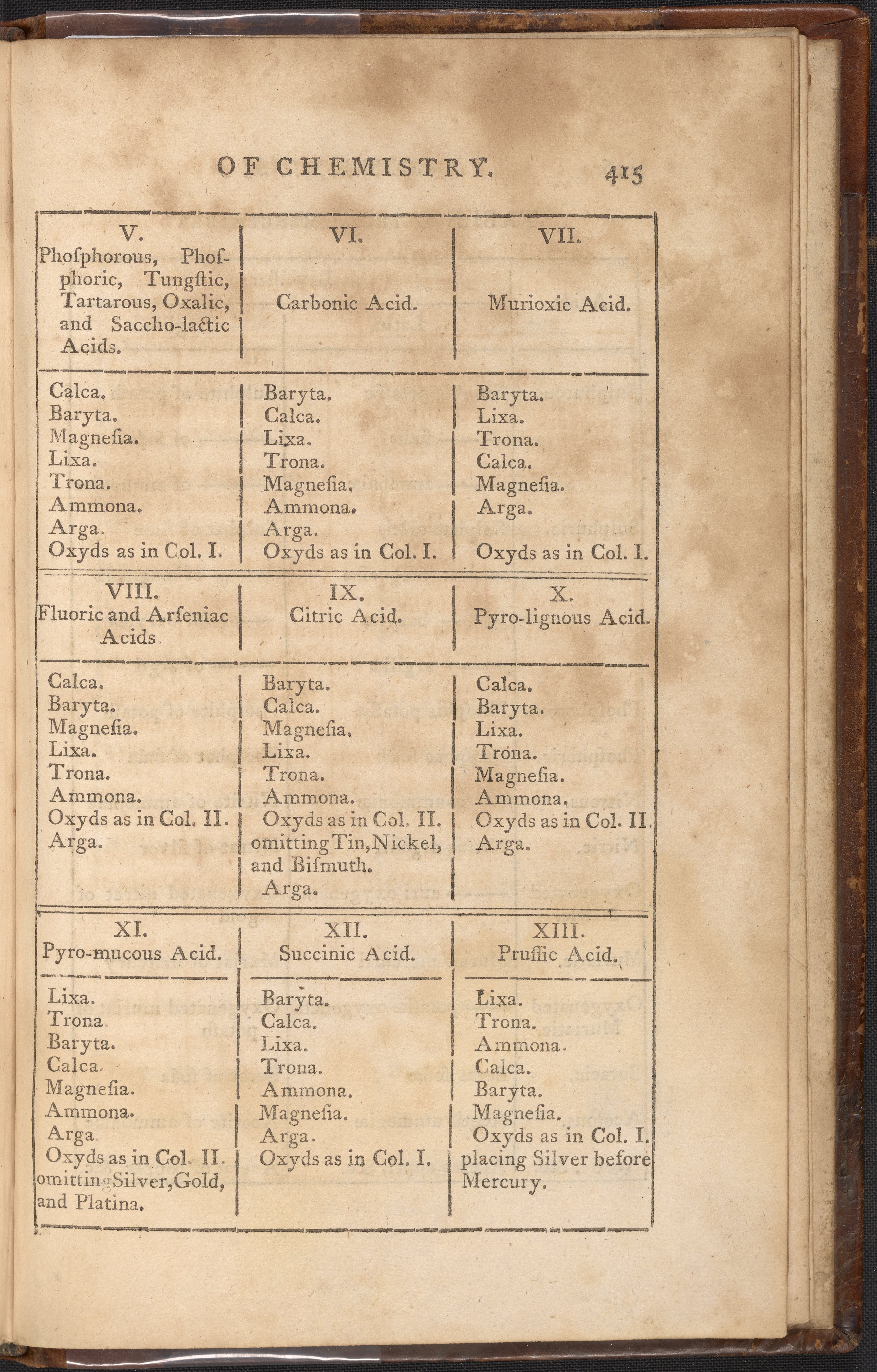 This edition included so many additions that it was necessary to divide it into two volumes, of which this is the first. Digitized content includes foldouts depicting a Table of the Binary Combinations of Oxygen and Simple Substances, Table of the Combinations of Acetous Acids with the Salisiable Bases in the Order of Affinity, as well as tables presenting chemical nomenclature guidelines and acids in order of electron affinity.