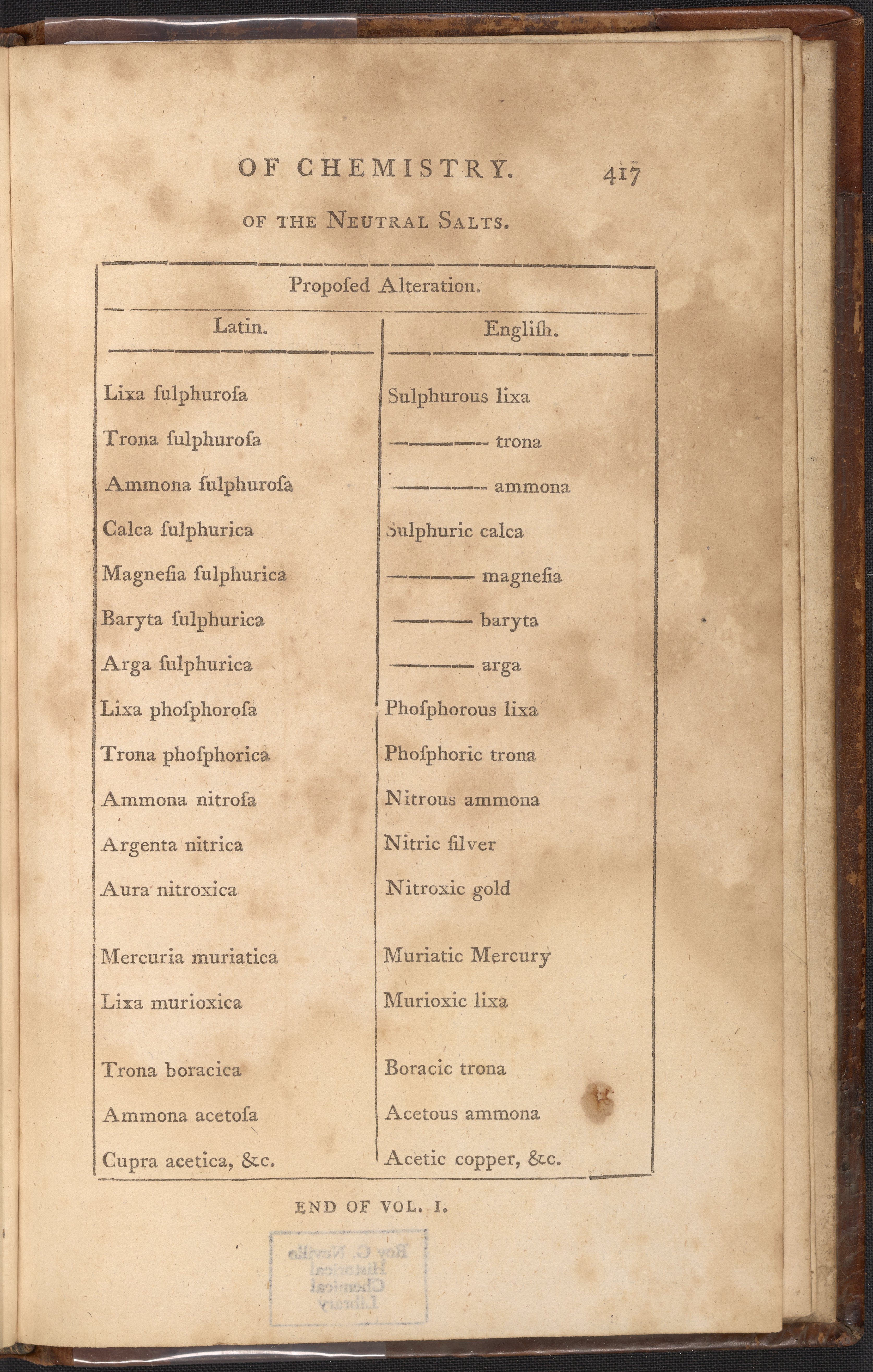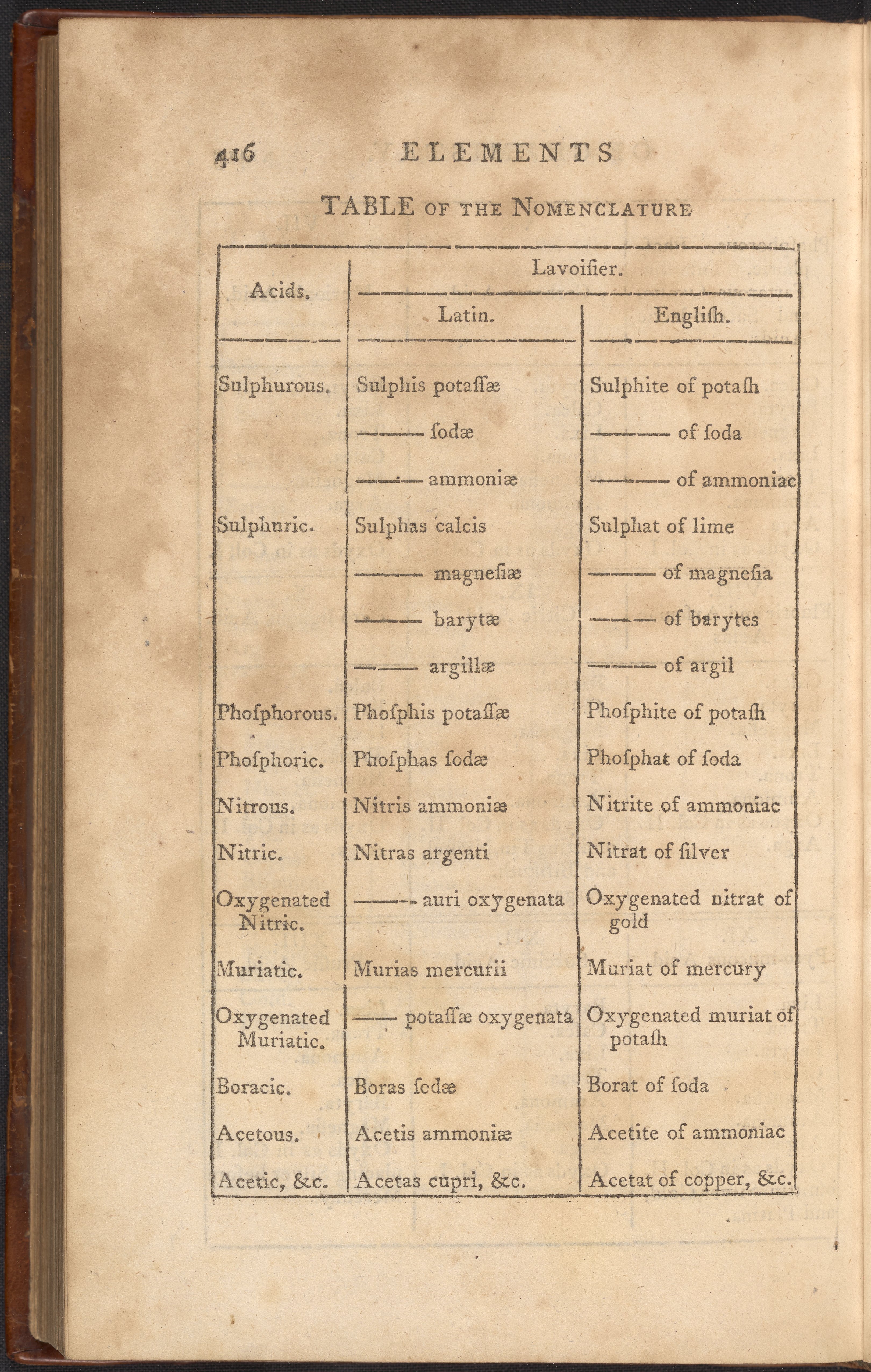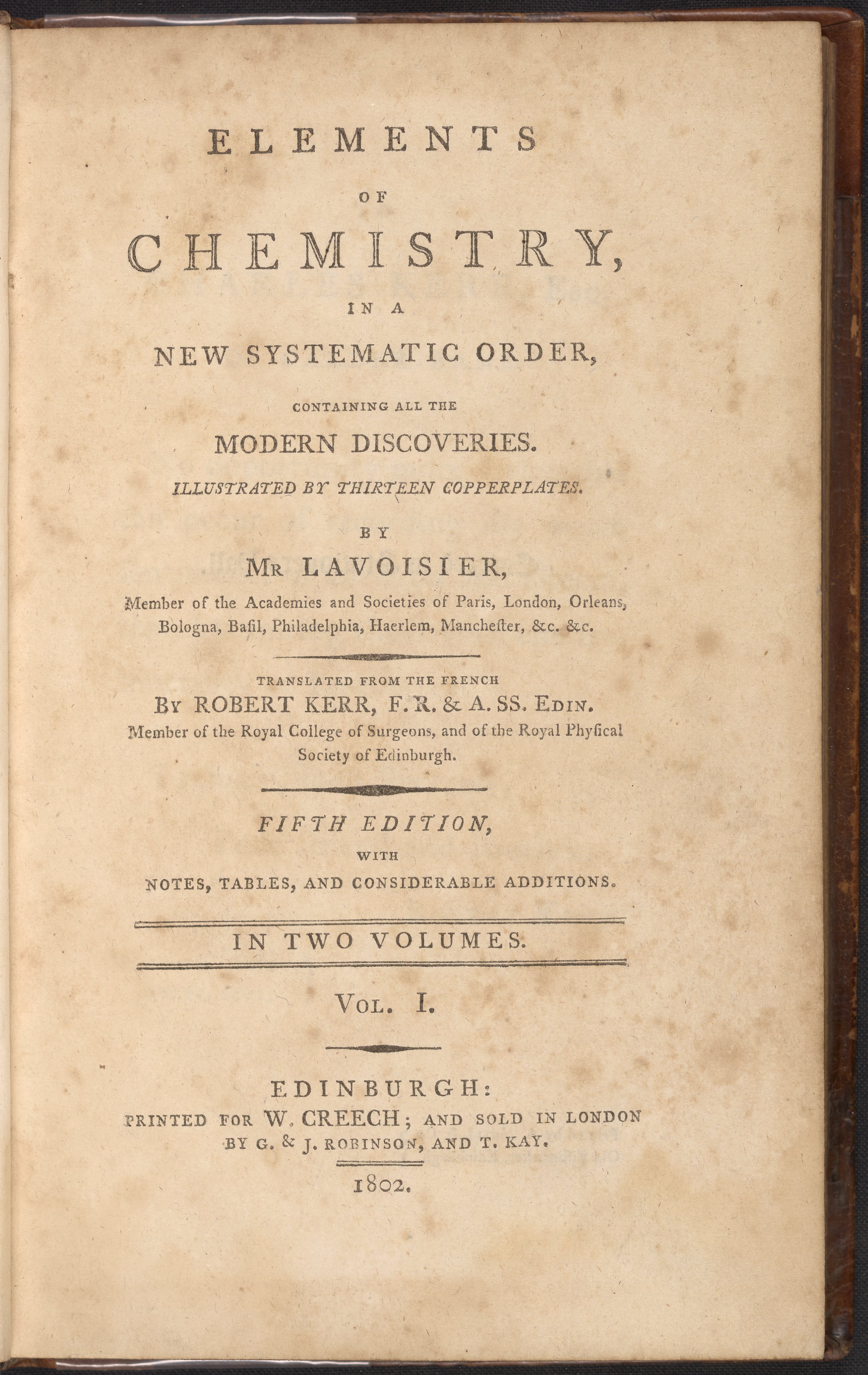 Lavoisier, Antoine Laurent. Elements of Chemistry : in a New Systematic Order, Containing All the Modern Discoveries Volume 1. Edinburgh, Scotland: William Creech, 1802. https://digital.sciencehistory.org/works/eqz1y6v.