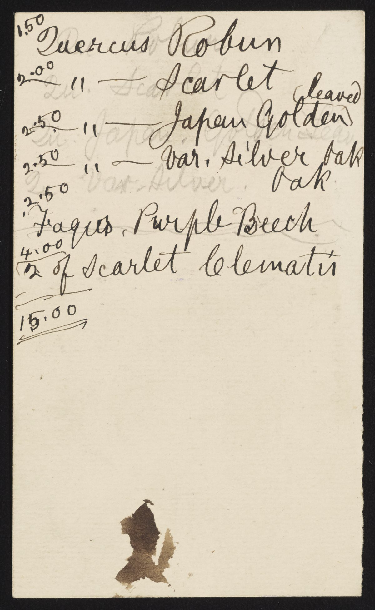 Small JPG1200 x 739px — 147 KBFull-sized JPG2810 x 1730px — 568 KBOriginal fileTIFF — 2810 x 1730px — 14.0 MBJames Curtis Booth (1810-1888) has written a list of trees and their prices totaling $15.00 on the verso.