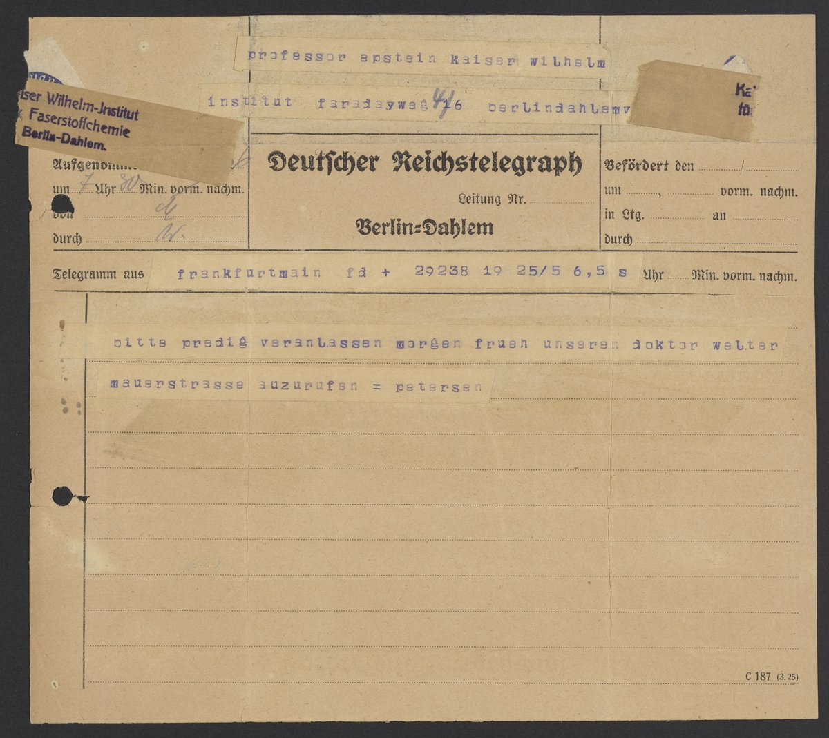 “Telegram to Professor Epstein,” n.d. Papers of Georg and Max Bredig. Science History Institute. Philadelphia. https://digital.sciencehistory.org/works/erfgccc.