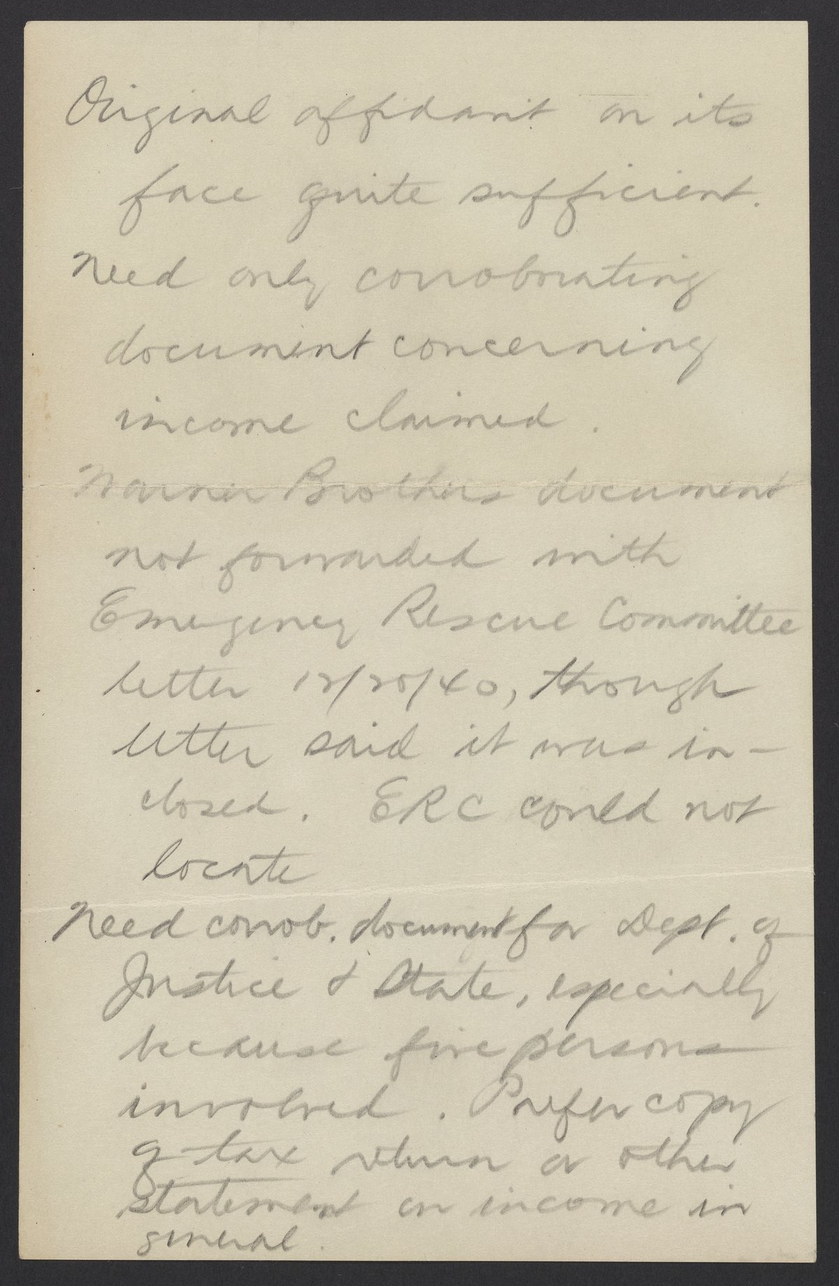 Note written by an unknown author concerning the need for an income statement for the Emergency Rescue Committee.
