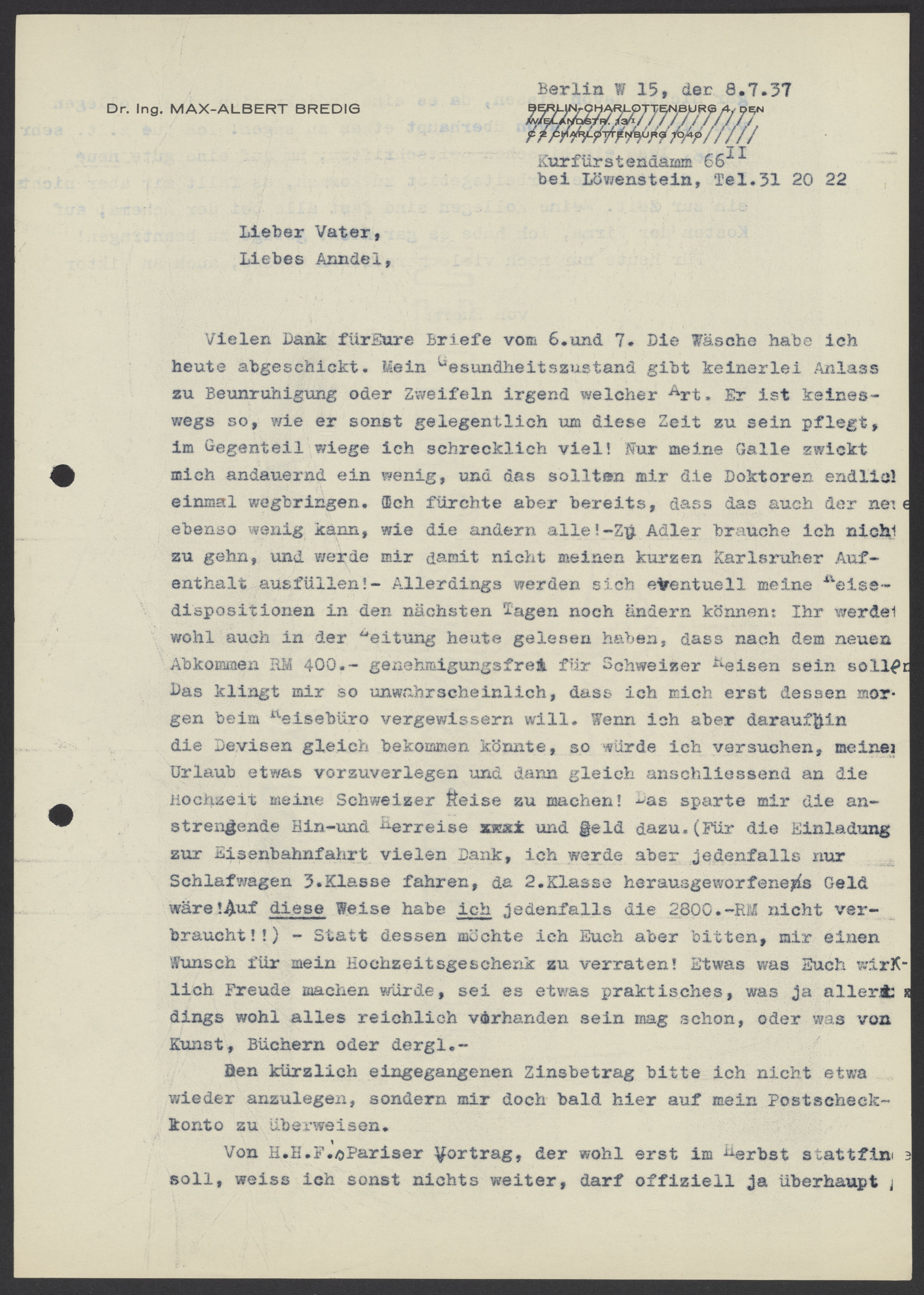 Thank you for your letters from the 6th and 7th of this month. I sent the laundry off today. Please don’t worry about my state of health. It is by no means as bad as it usually is this time of year. On the contrary, I weigh an awful lot! My gallbladder bothers me sometimes and the doctors should finally diagnose me. I fear that my new doctor can’t do any more than all the others! I don't need to see Dr. Adler, and I don’t want to waste any time doing that during my short visit in Karlsruhe! However, my travel plans may change in the next few days. You will have probably read in the newspaper today that, according to the new agreement, it costs 400 Reichsmarks to travel without a permit in Switzerland. That sounds very improbable and I want to double check with the travel agency tomorrow. If I could acquire foreign currency right away, I would try to postpone my vacation and then travel to Switzerland after the wedding. That would save unnecessary travel time and money. (Thank you very much for offering to pay for my train ride, but I will only reserve a 3rd class sleeping car because 2nd class would waste money! In any case, I didn't spend 2800 Reichsmarks on this!!) Instead, please tell me what you would like as a wedding present. It should be something that you would really enjoy, be it something practical that is widely available, or something special like art, books, etc.