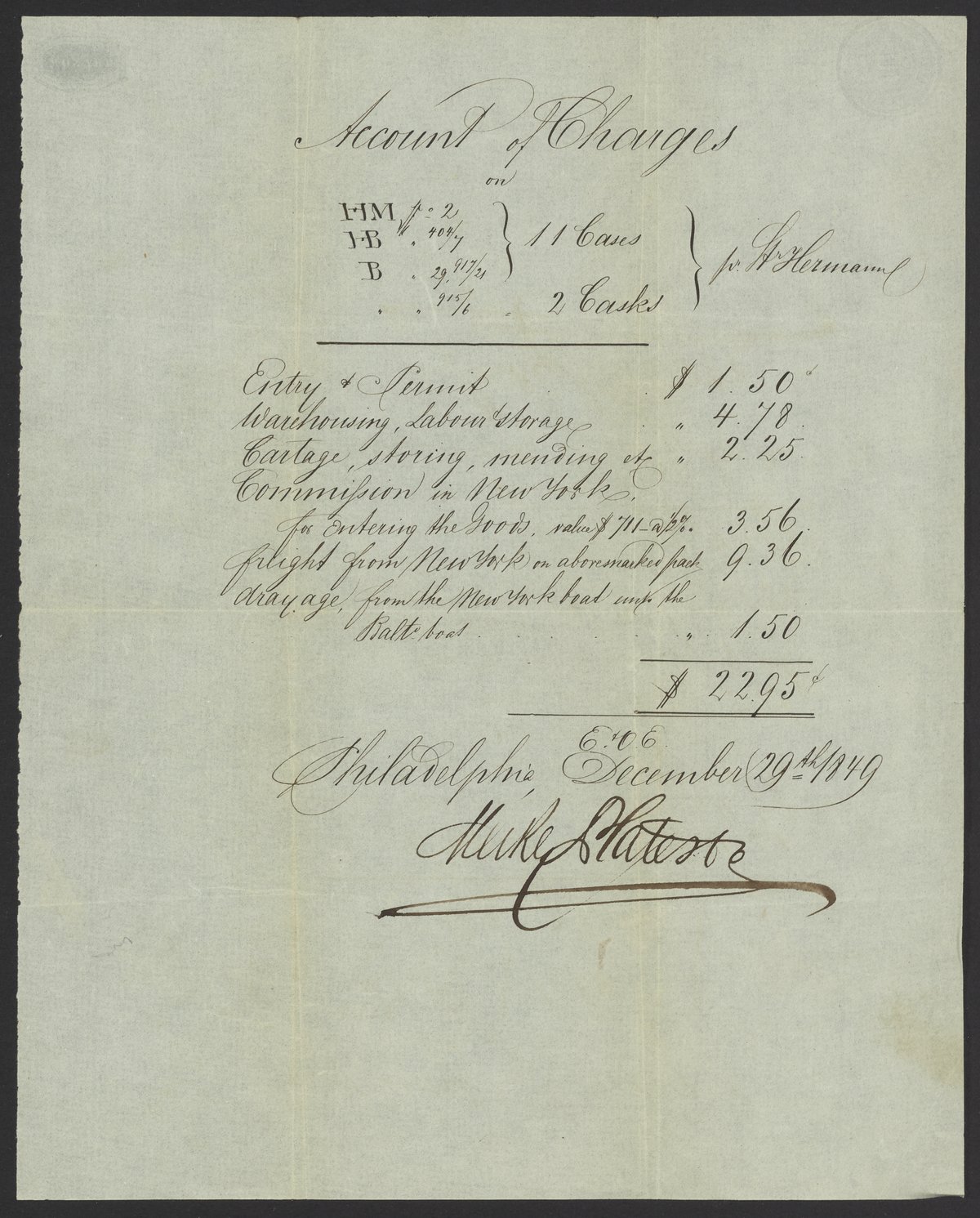 Morfit, Campbell. “List of Account Charges, December 29, 1849,” December 29, 1849. Papers of James Curtis Booth, Box 1, Folder 10. Science History Institute. Philadelphia. https://digital.sciencehistory.org/works/ex345s5.