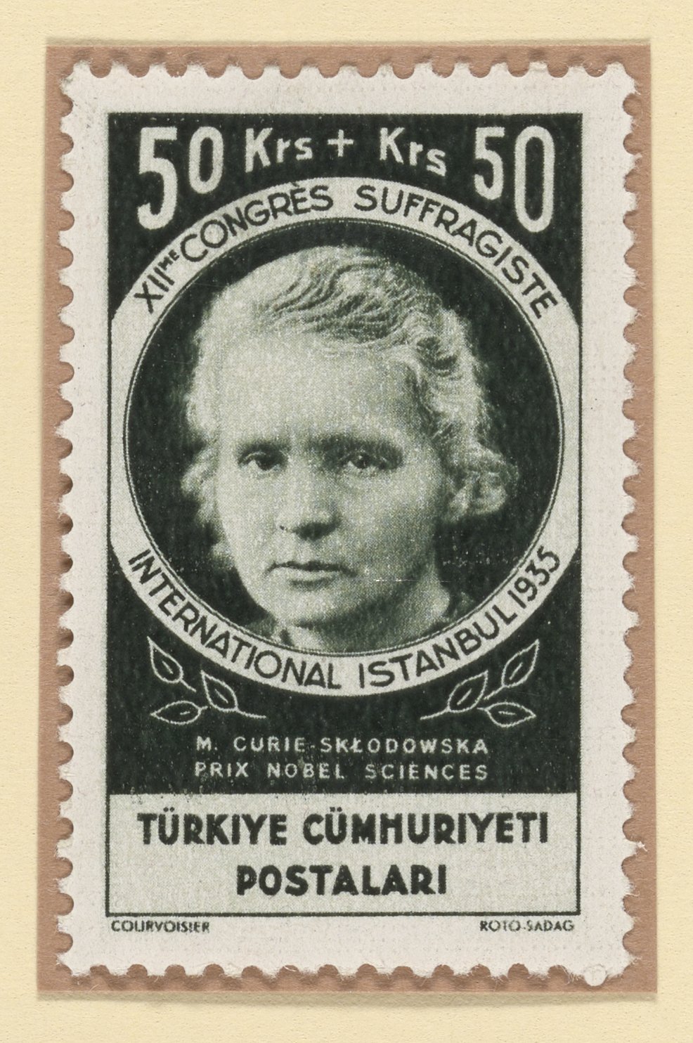 “Turkish Stamp Commemorating Marie Curie,” April 18, 1935. Witco Stamp Collection, Box 2. Science History Institute. Philadelphia. https://digital.sciencehistory.org/works/exyldef.