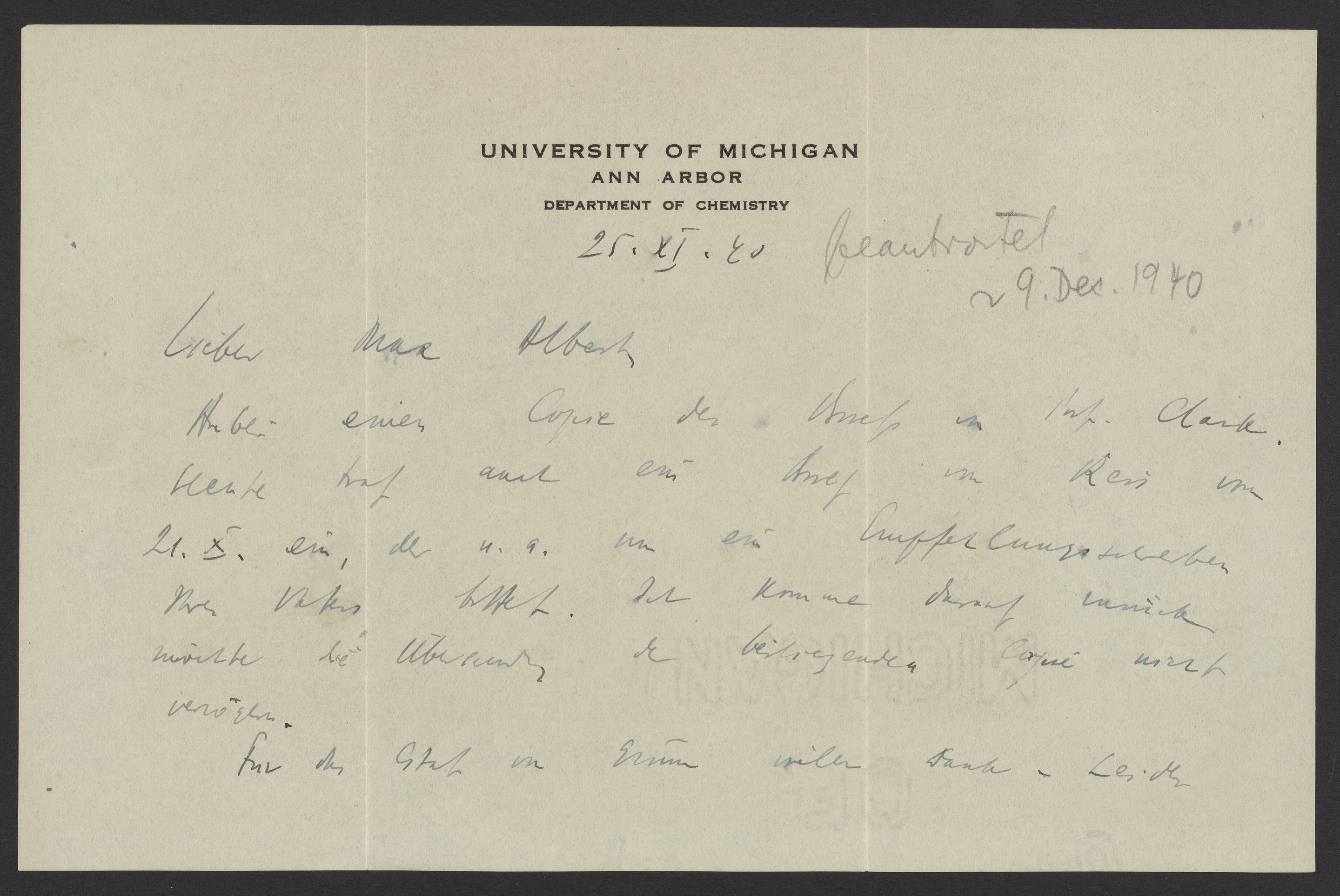 [Max Bredig‘s hand: answered on December 29, 1940)
