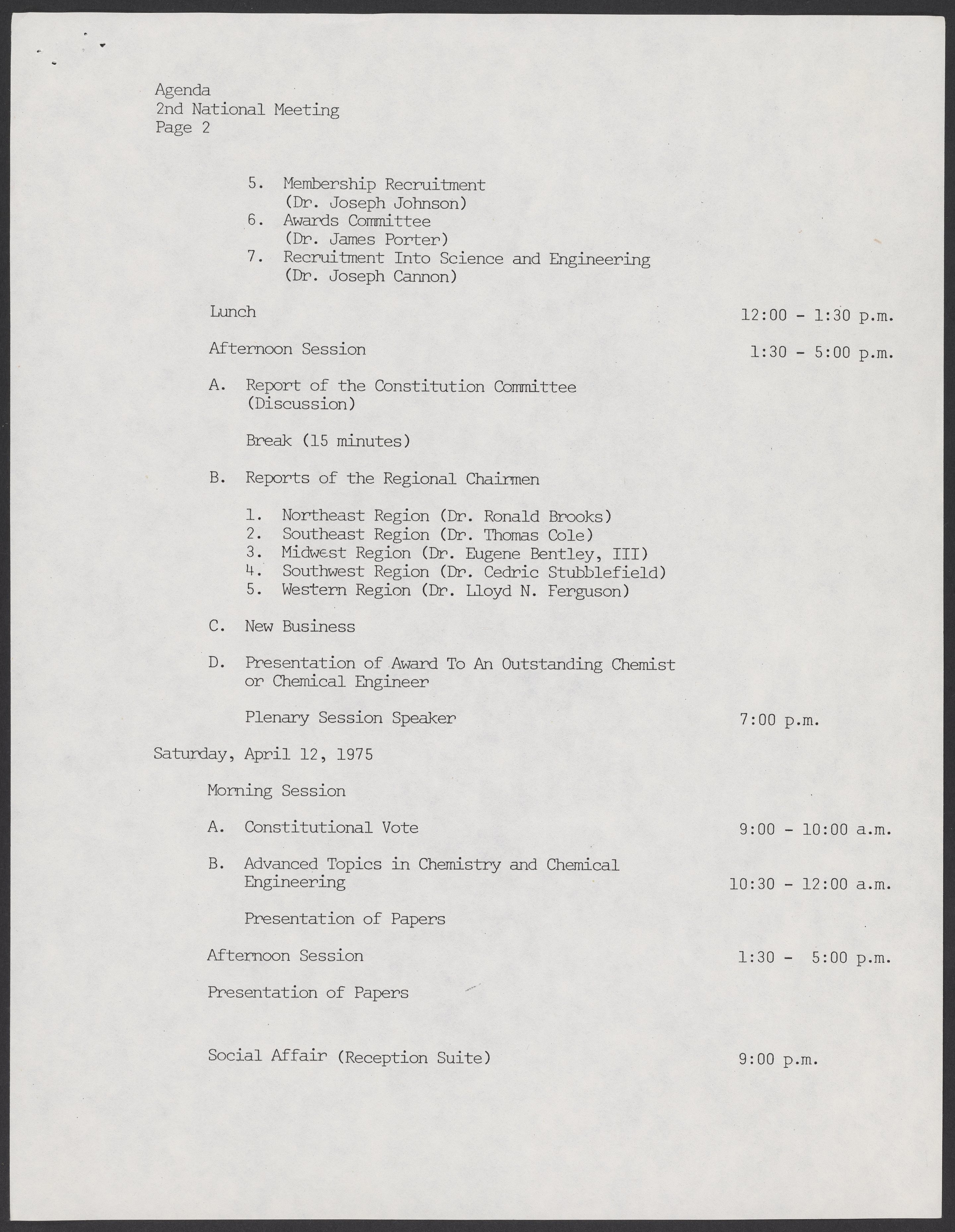 Small JPG1200 x 1545px — 278 KBLarge JPG2880 x 3707px — 1.4 MBFull-sized JPG5390 x 6938px — 4.9 MBOriginal fileTIFF — 5390 x 6938px — 107 MBWilliam A. Guillory, announces the 2nd Annual National Meeting of the Black Chemists and Chemical Engineers, held by the National Organization for the Professional Advancement of Black Chemists and Chemical Engineers (NOBCChE). Attached to the announcement is an agenda for the conference, and a call for papers to present.