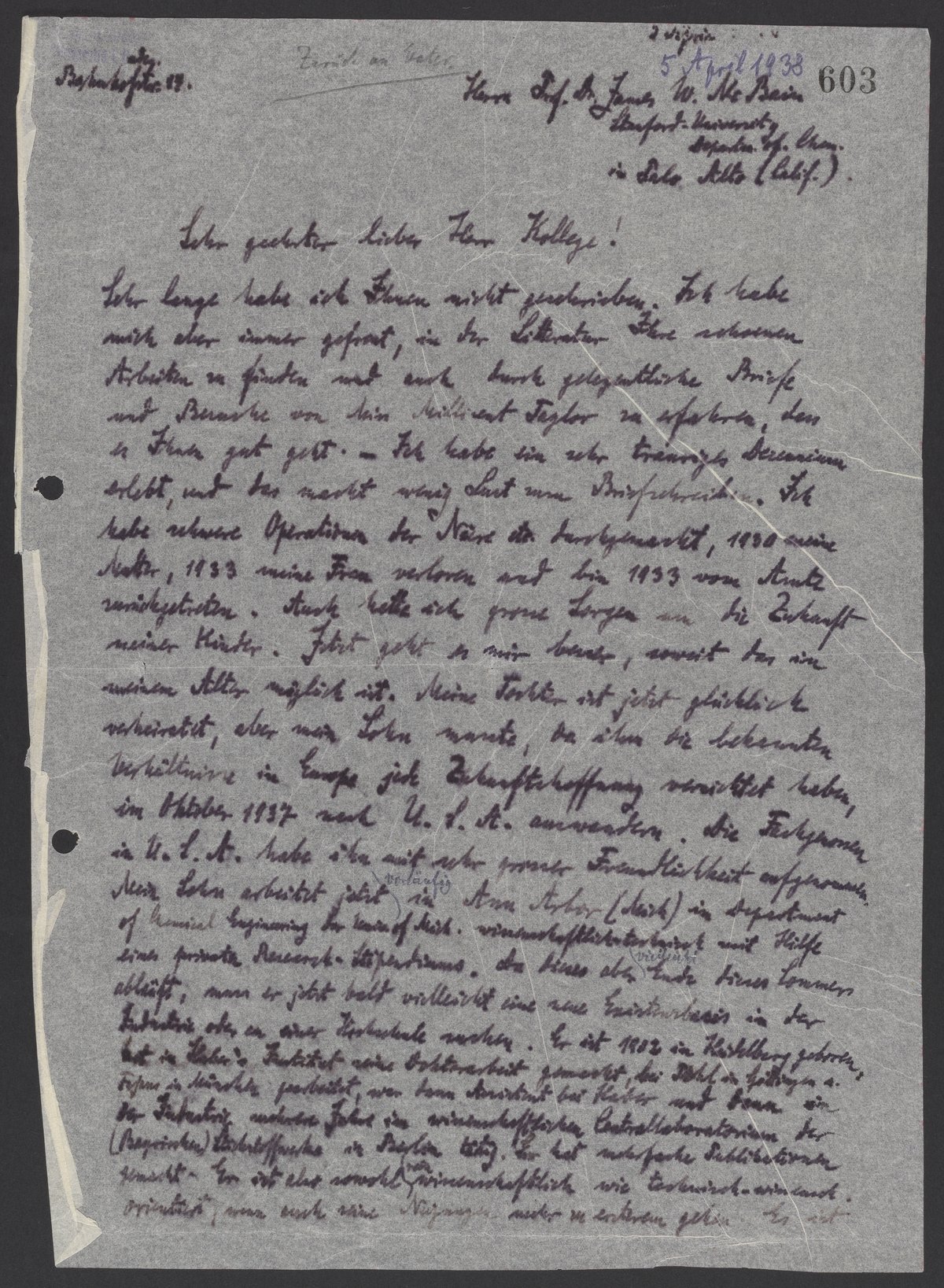 Letter from Georg Bredig to Professor James W. McBain
