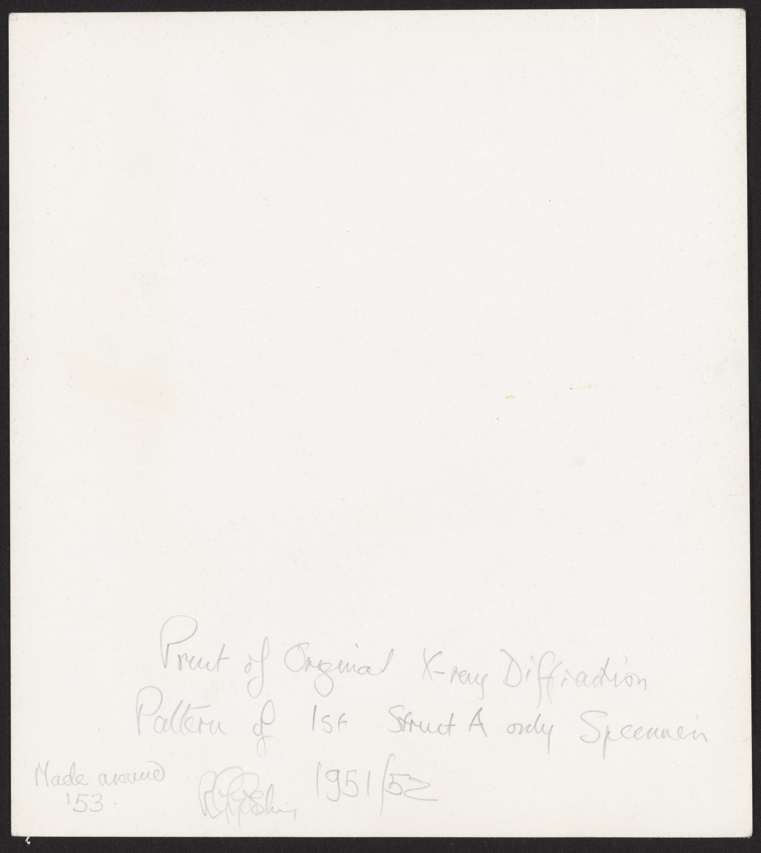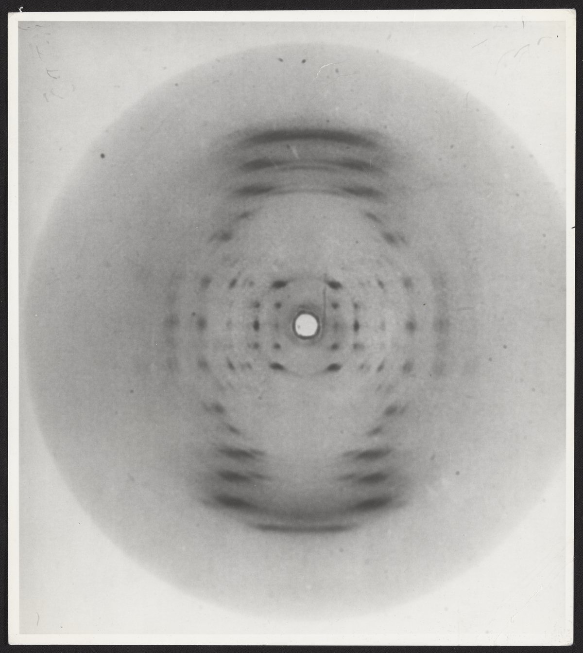 Small JPG1200 x 1343px — 162 KBLarge JPG2880 x 3222px — 996 KBFull-sized JPG4838 x 5413px — 2.6 MBOriginal fileTIFF — 4838 x 5413px — 30.5 MBPhotographic print of X-ray diffraction image of DNA in the "A" form with annotation by Raymond Gosling (1926-2015). The original image was made by Rosalind Franklin (1920-1958) and her student Raymond Gosling (1926-2015) at King’s College London in 1952. It was published by Franklin and Gosling in the July 1953 issue of Nature, which described the A-form of DNA. The photo is annotated on the reverse by Gosling in ink and reads, “Print of Original X-ray Diffraction Pattern of 1st Struct A only Specimen. Made around '53. R.G. Gosling. 1951/52"