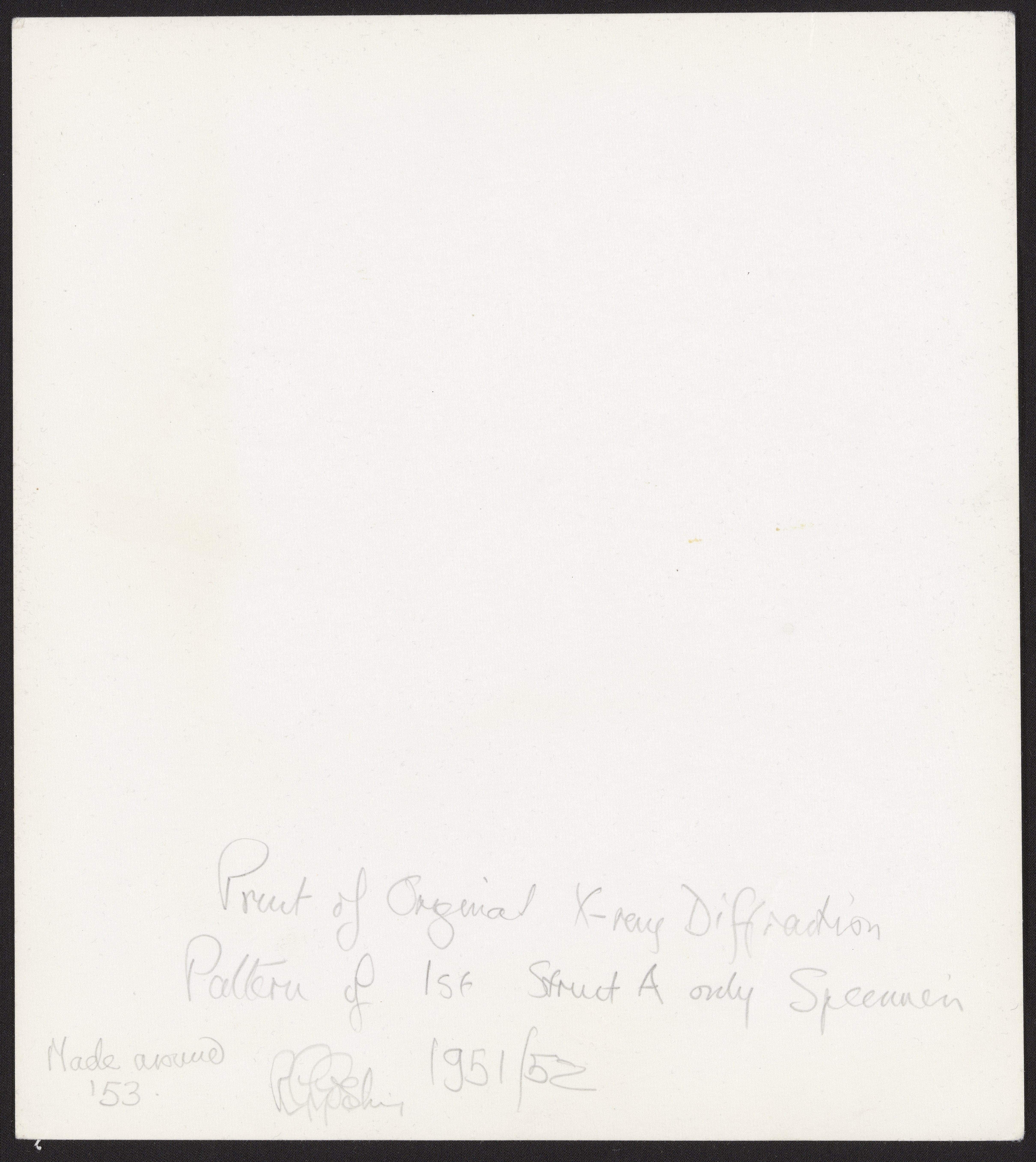 Small JPG1200 x 1343px — 162 KBLarge JPG2880 x 3222px — 996 KBFull-sized JPG4838 x 5413px — 2.6 MBOriginal fileTIFF — 4838 x 5413px — 30.5 MBPhotographic print of X-ray diffraction image of DNA in the "A" form with annotation by Raymond Gosling (1926-2015). The original image was made by Rosalind Franklin (1920-1958) and her student Raymond Gosling (1926-2015) at King’s College London in 1952. It was published by Franklin and Gosling in the July 1953 issue of Nature, which described the A-form of DNA. The photo is annotated on the reverse by Gosling in ink and reads, “Print of Original X-ray Diffraction Pattern of 1st Struct A only Specimen. Made around '53. R.G. Gosling. 1951/52"