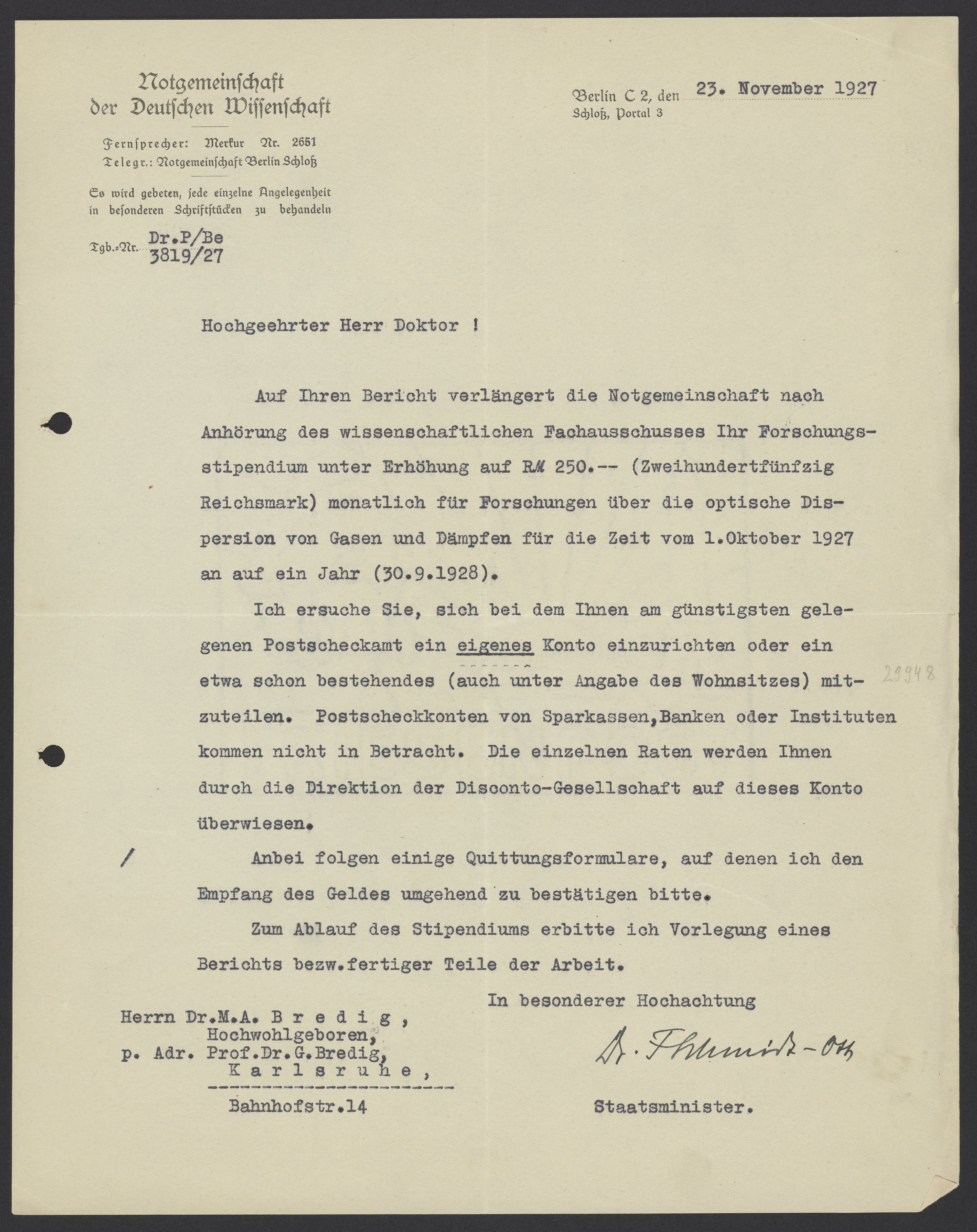 Friedrich Schmidt-Ott (1860-1955), the Prussian Minister of Culture and chairman of the "Notgemeinschaft der Deutschen Wissenschaft" (German Science Funding Association), informs Max Bredig (1902-1977) that his grant for research on the optical dispersion of gases and vapors will be extended for one year. At the time, Bredig worked in the laboratory of Kasimir Fajans (1887-1975) at the Ludwig Maximilian University of Munich. A decade later, Bredig would join Fajans at the University of Michigan in Ann Arbor, Michigan after emigrating from Nazi-occupied Germany.