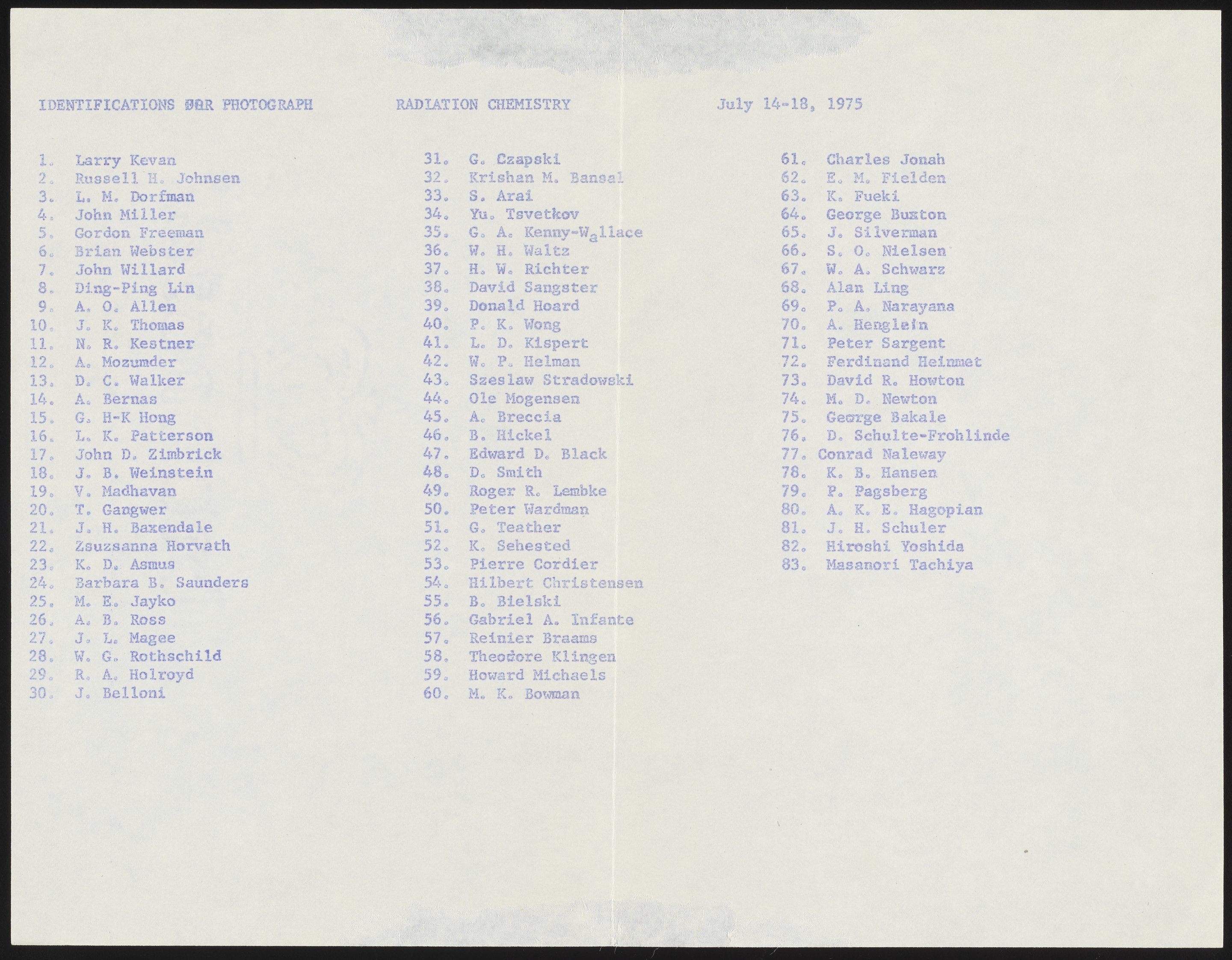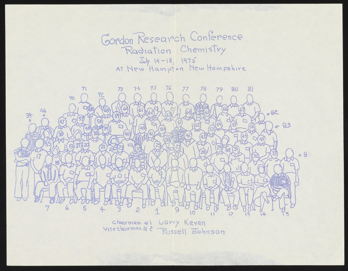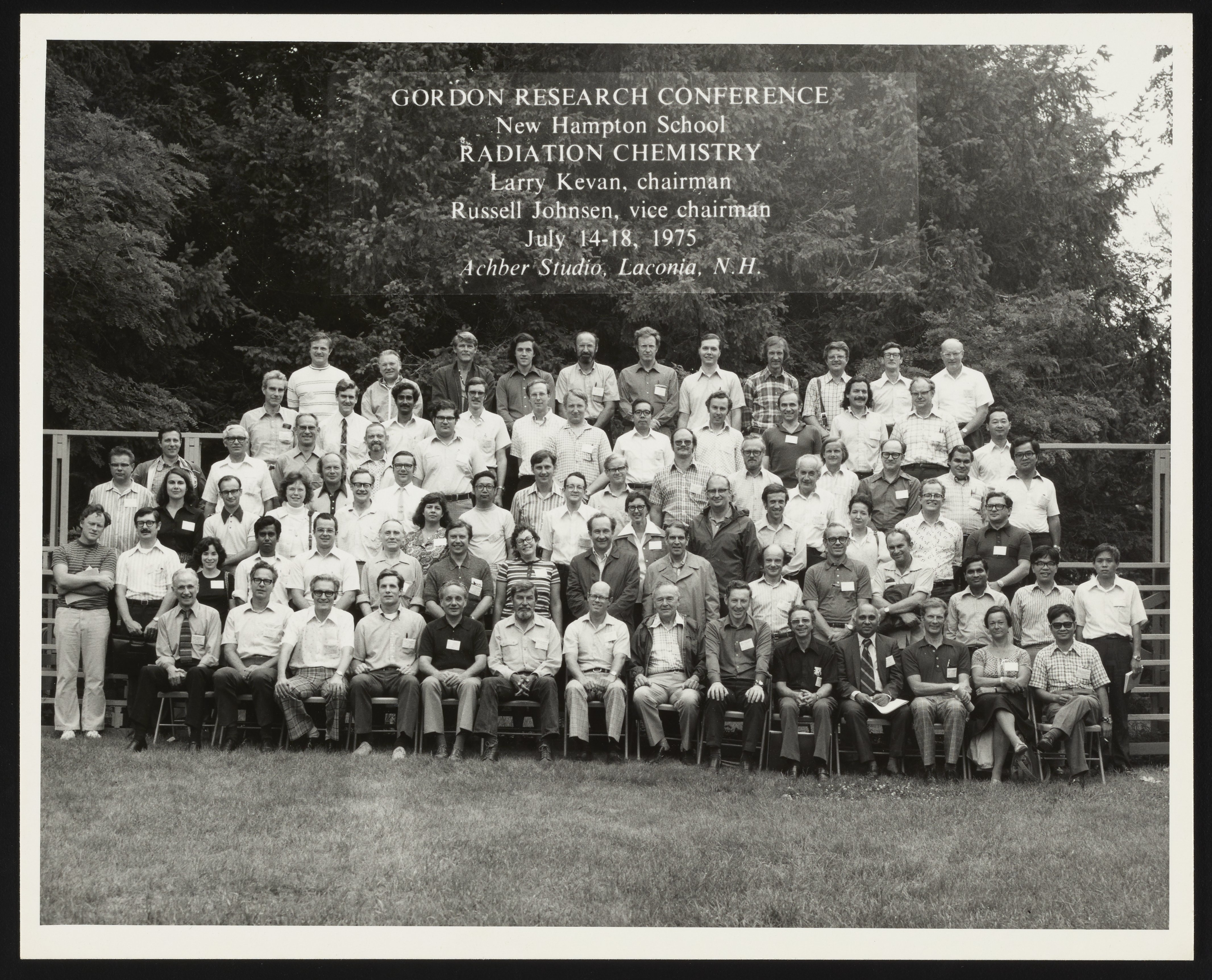 Small JPG1200 x 970px — 297 KBLarge JPG2880 x 2329px — 1.2 MBFull-sized JPG4265 x 3449px — 2.2 MBOriginal fileTIFF — 4265 x 3449px — 42.1 MBGroup photograph of attendees at the Gordon Research Conference on Radiation Chemistry held in New Hampton, New Hampshire in July 1975. Included with the photograph are a hand-drawn key and name list identifying the individuals depicted in the photo.