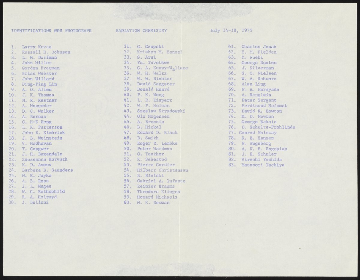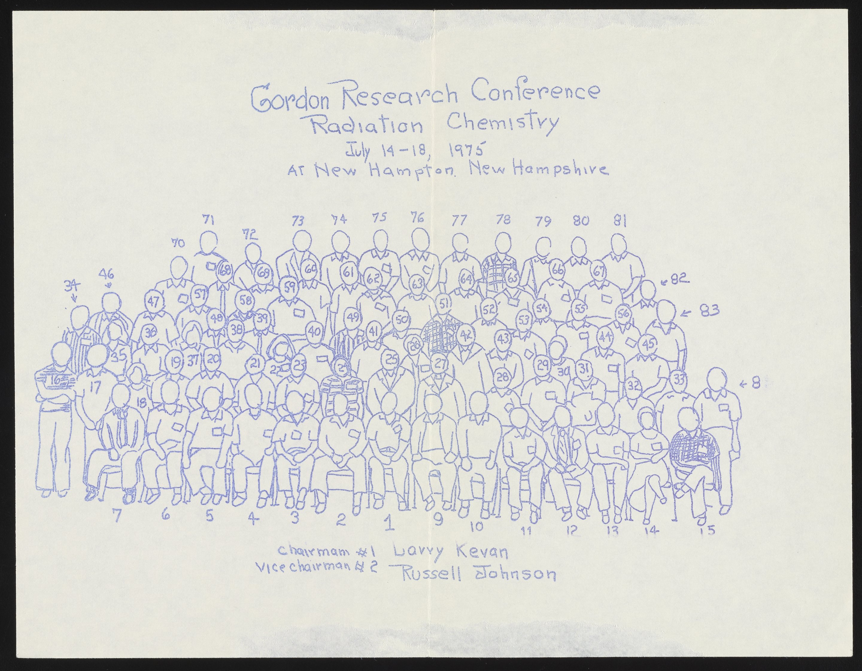 Small JPG1200 x 970px — 297 KBLarge JPG2880 x 2329px — 1.2 MBFull-sized JPG4265 x 3449px — 2.2 MBOriginal fileTIFF — 4265 x 3449px — 42.1 MBGroup photograph of attendees at the Gordon Research Conference on Radiation Chemistry held in New Hampton, New Hampshire in July 1975. Included with the photograph are a hand-drawn key and name list identifying the individuals depicted in the photo.