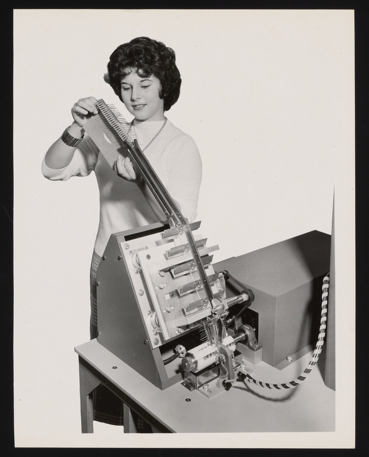 “Woman Using a Beckman Model AB-4-5 Sorting Bridge,” n.d. Beckman Historical Collection, Box 79. Science History Institute. Philadelphia. https://digital.sciencehistory.org/works/f1881m035.