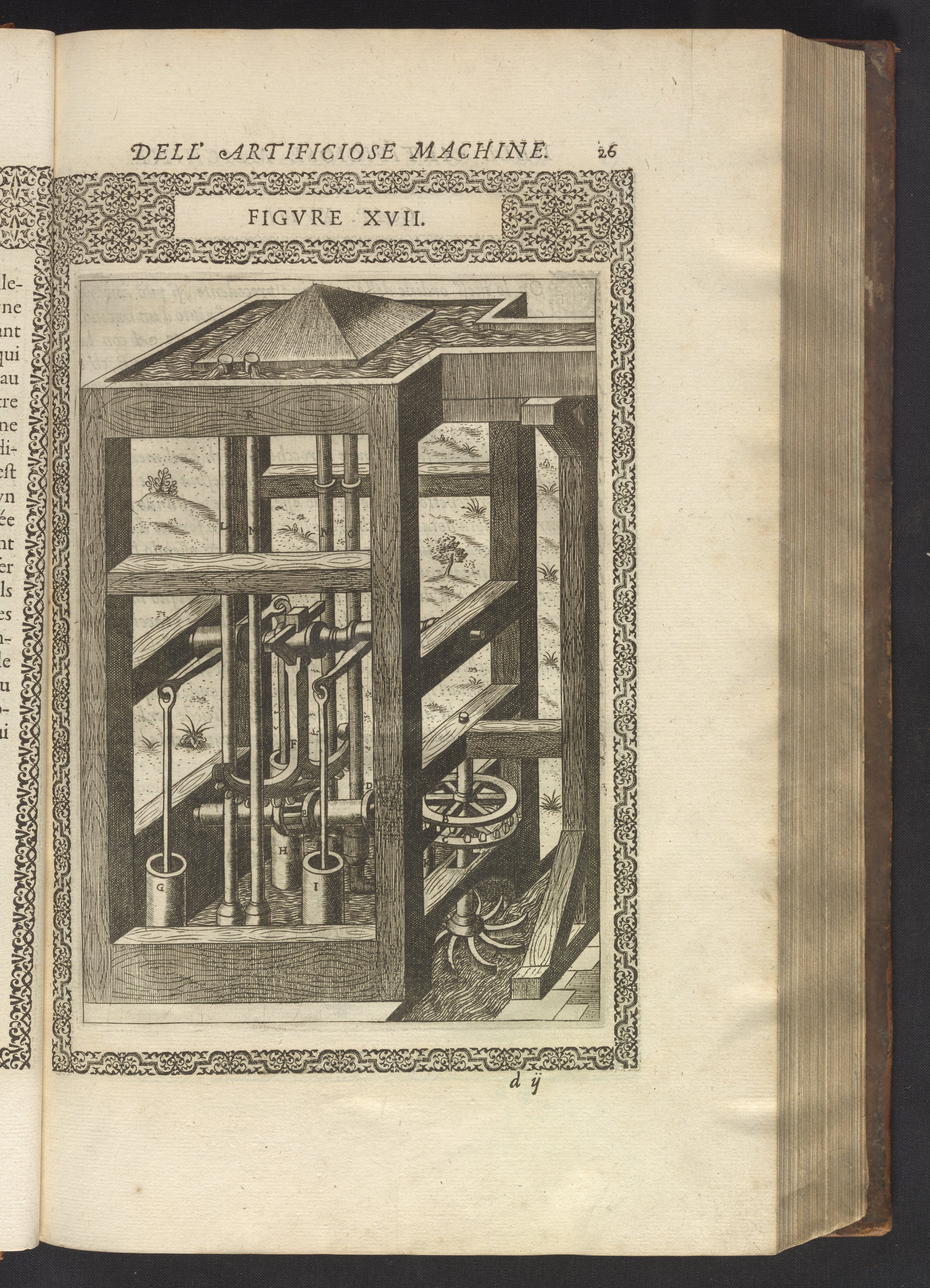 Ramelli, Agostino. “Plate 17: Device for Raising Water from a Low Place by River or Canal Current.” In Le Diverse Et Artificiose Machine Del Capitano Agostino Ramelli. Paris, France, 1588. https://digital.sciencehistory.org/works/f1881m05q.