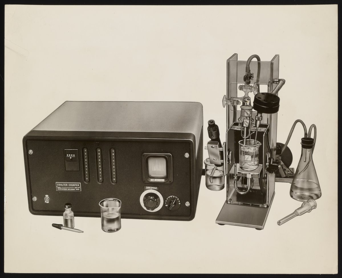 “Coulter Counter Model A Cell Counter,” 1970–1989. Beckman Historical Collection, Box 58, Folder 92. Science History Institute. Philadelphia. https://digital.sciencehistory.org/works/f1881m41k.