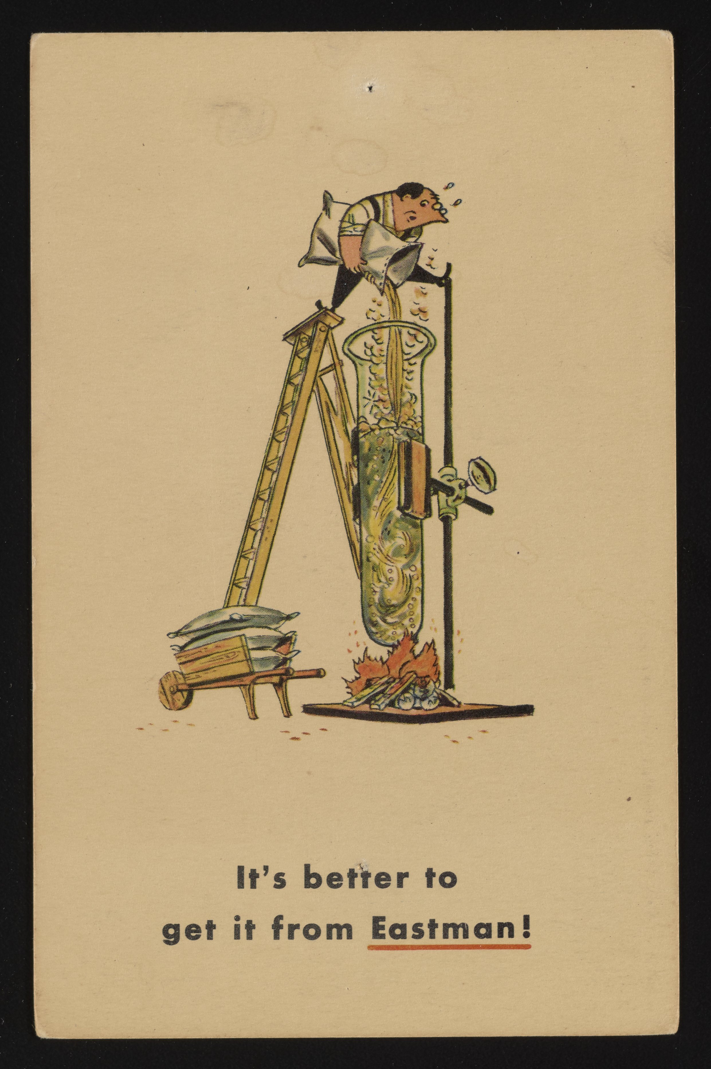 Front and back of an illustrated color postcard advertising the products and services of the Eastman Organic Chemicals Department (Division of the Eastman Kodak Company). The postcard features a humorous depiction of a man using a make-shift apparatus to brew his own chemicals. Postmarked from Rochester, New York, the postcard also includes a brief summary of the products and services of Eastman’s Distillations Products Industries division.
