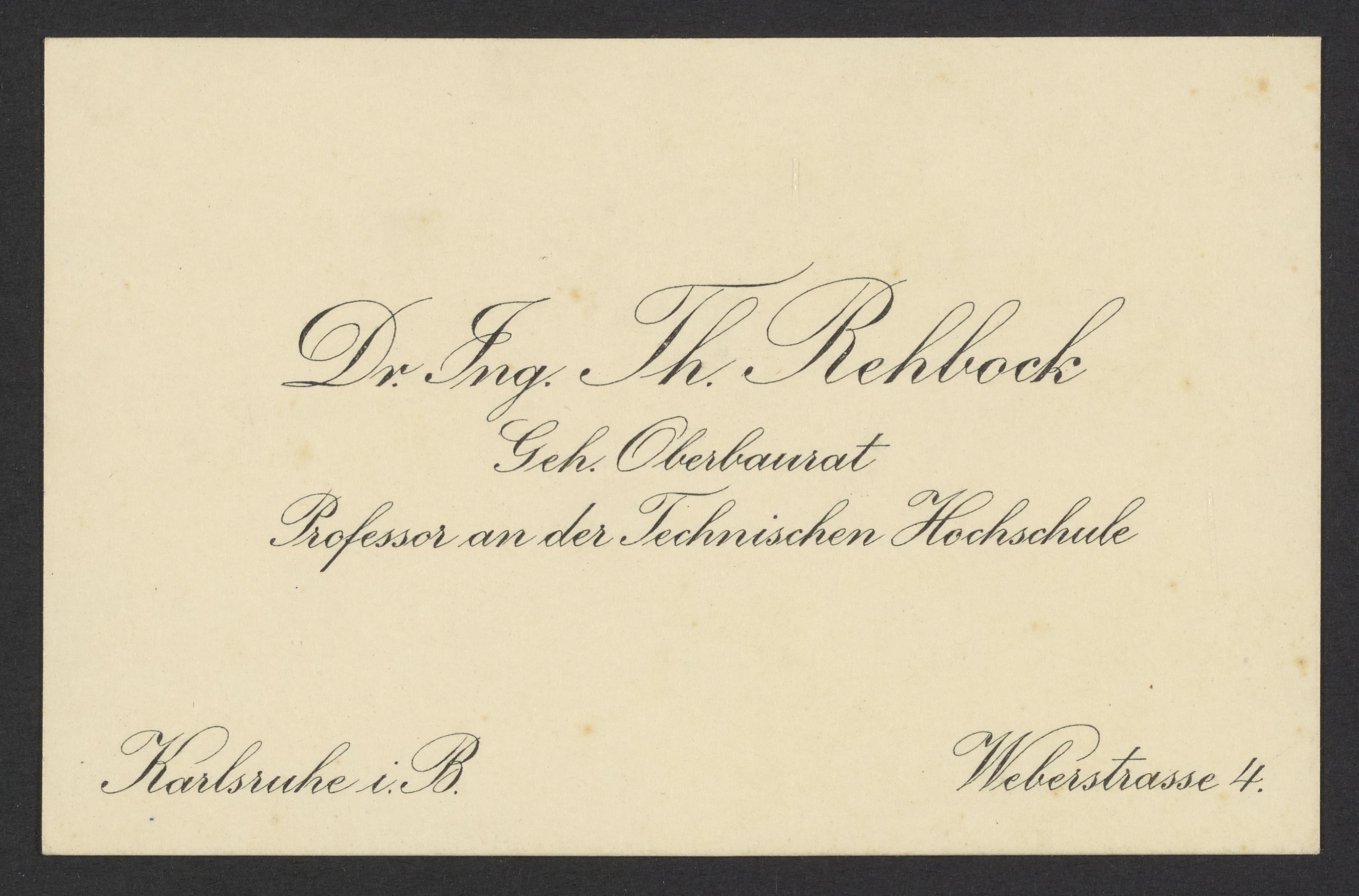 Small JPG1200 x 791px — 110 KBFull-sized JPG2711 x 1788px — 535 KBOriginal fileTIFF — 2711 x 1788px — 13.9 MBCalling card belonging to Theodor Rehbock (1864-1950), a hydraulics engineer, professor, and rector of the University of Karlsruhe. Verso includes a note to Georg Bredig (1868-1944) written by Rehbock.