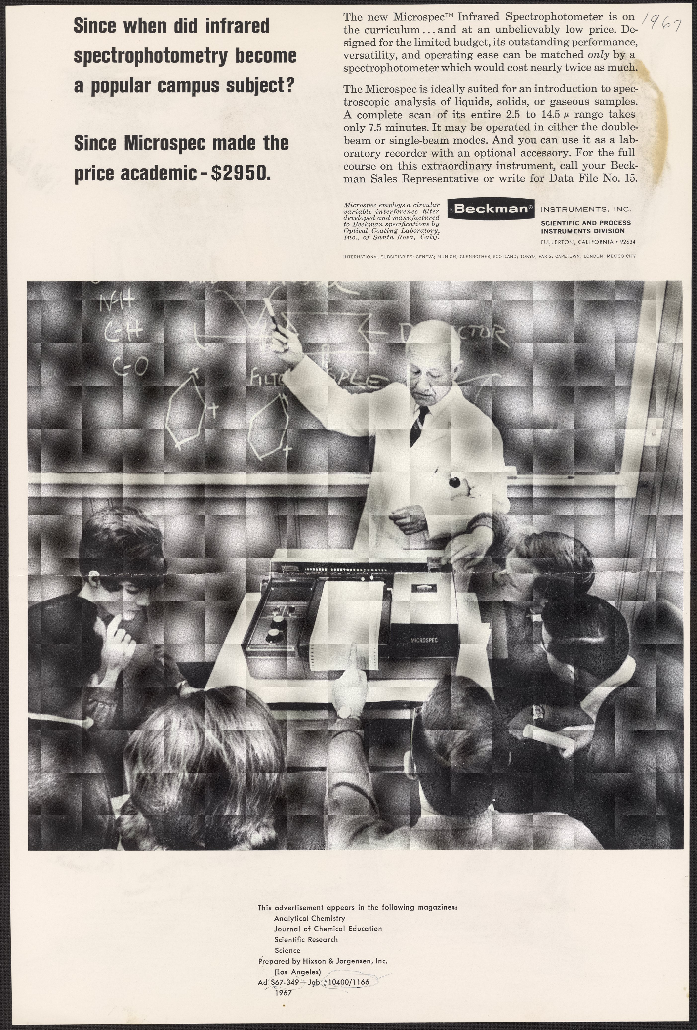Hixson and Jorgensen, and Inc. Beckman Instruments. “Since When Did Infrared Spectrophotometery Become a Popular Campus Subject?,” 1967. Beckman Historical Collection, Box 49, Folder 25. Science History Institute. Philadelphia. https://digital.sciencehistory.org/works/f4752g745.