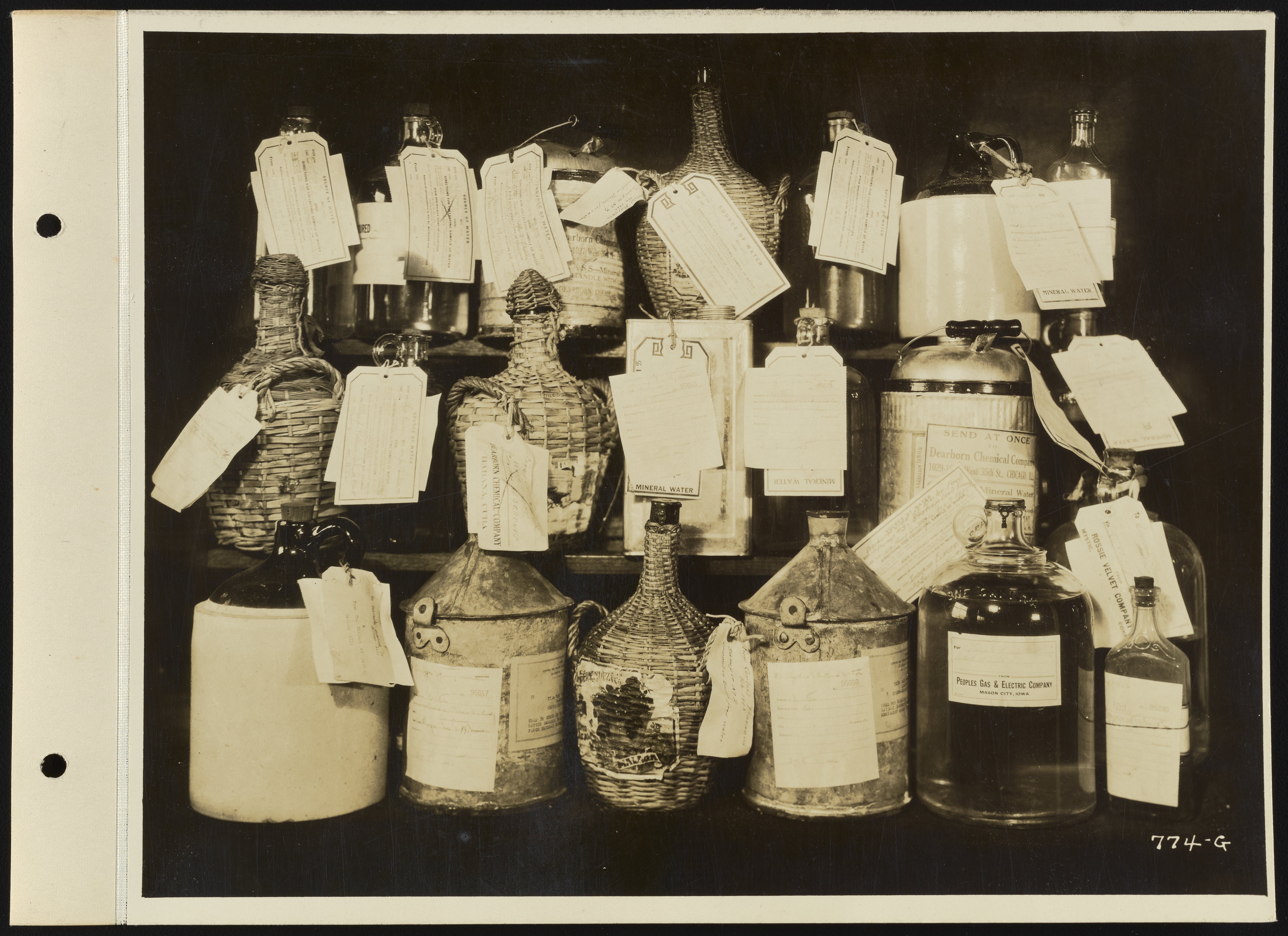 General view of assorted water samples sent to the Dearborn Chemical Company's 35th Street Laboratory for analysis. Founded in 1887, the Dearborn Chemical Company was a corporate ancestor of BetzDearborn, Incorporated best known for manufacturing water treatment chemicals for use in boilers and cooling towers.