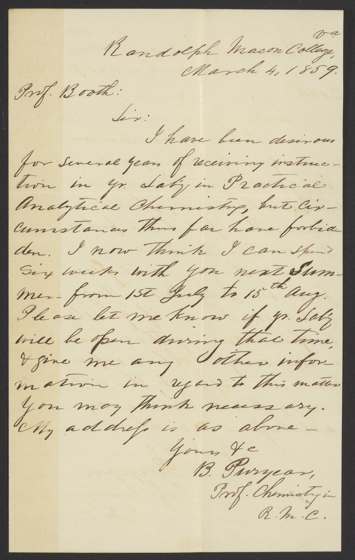 Puryear, a student of Randolph Macon College, wishes to study with James Curtis Booth (1810-1888).