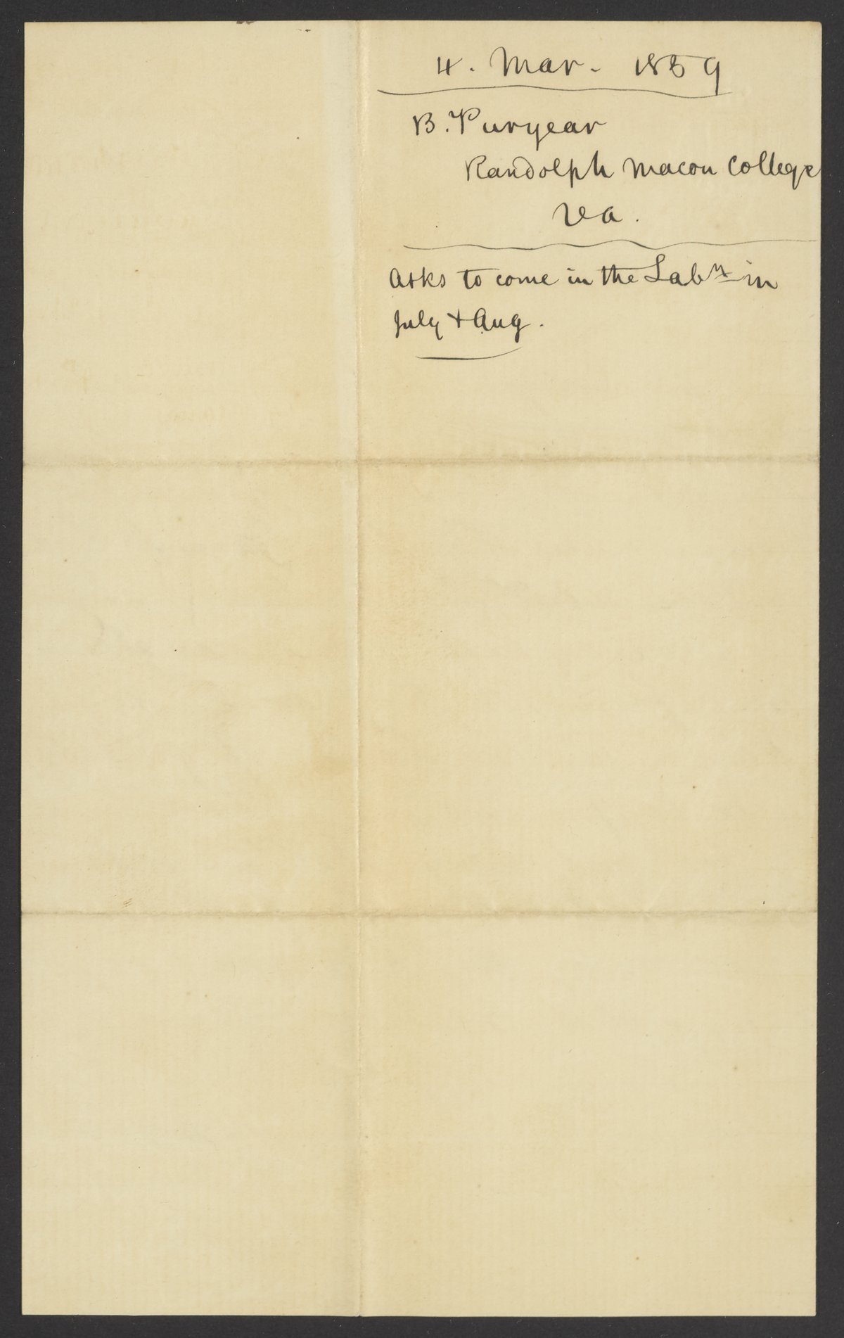 Puryear, B. “Letter from B. Puryear to James Curtis Booth, March 4, 1859,” March 4, 1859. Papers of James Curtis Booth, Box 1, Folder 7. Science History Institute. Philadelphia. https://digital.sciencehistory.org/works/f4tynqj.