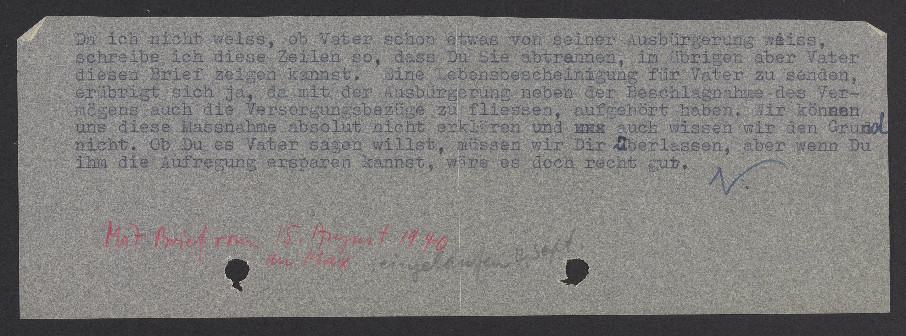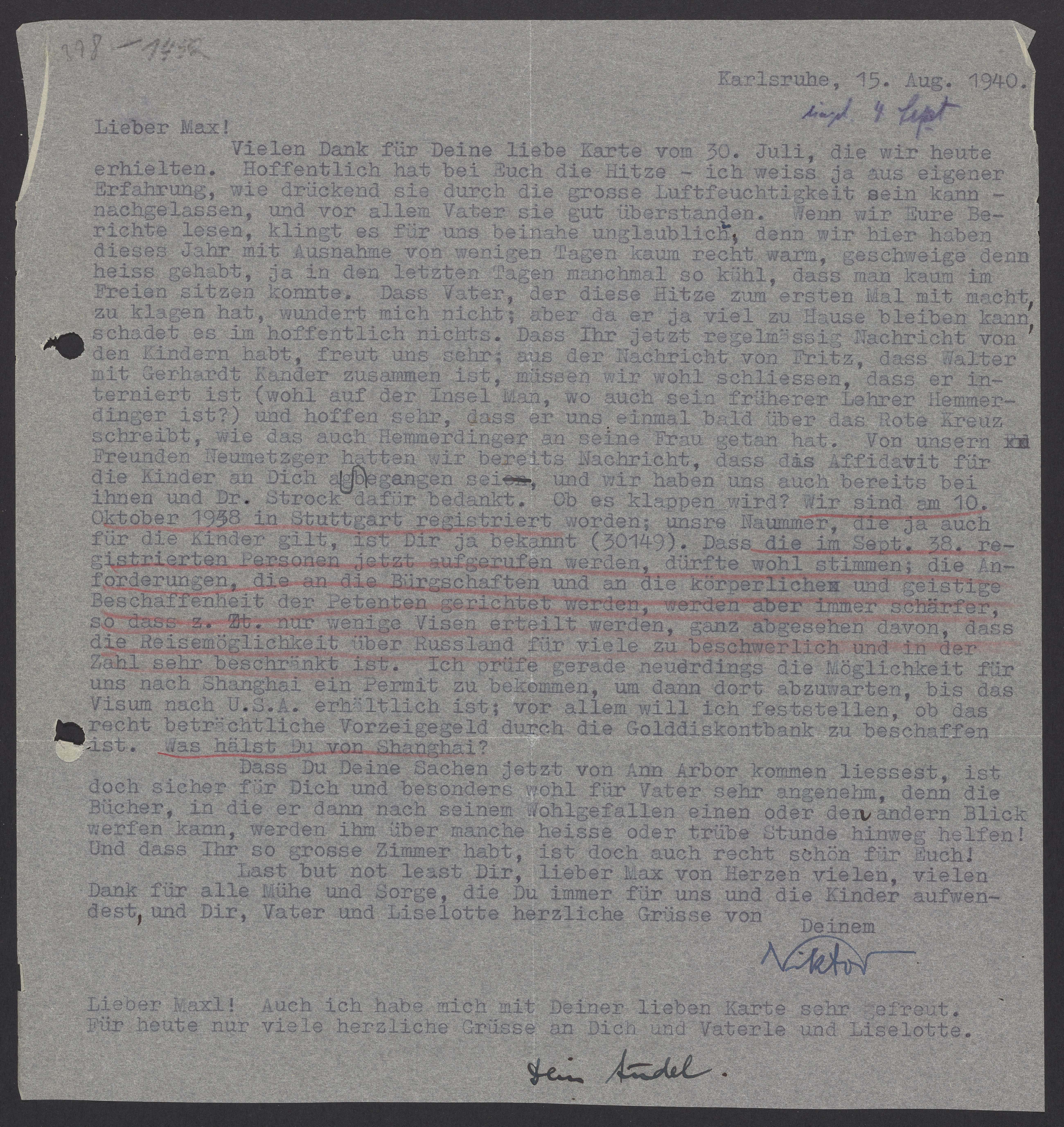 Letter from Marianne and Viktor Homburger to Max Bredig, August 15, 1940