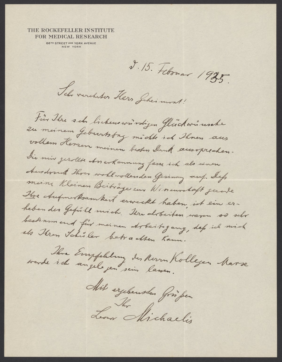 Letter from Leonor Michaelis to Georg Bredig