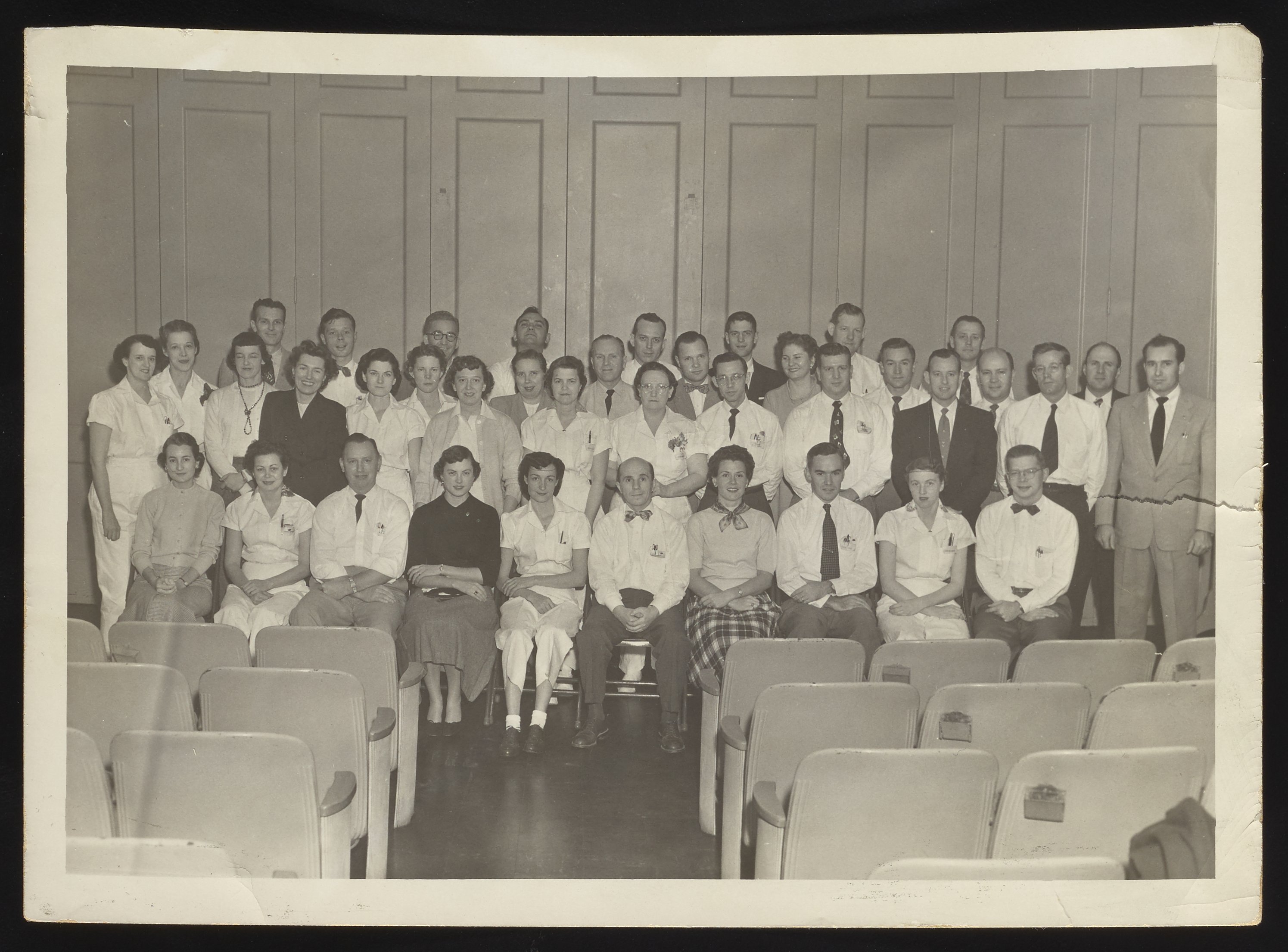 Group photograph of staff responsible for the development and manufacture of the "Type 9" textile at the DuPont plant in Martinsville, Virginia. Team supervisor Joseph X. Labovsky is seated at the center of the photograph Caroline Cooper, the first forewoman promoted to shift supervisor, is also seated in the front row, second from right. An identification key is inscribed on the back of the photograph, though many of the names are illegible.