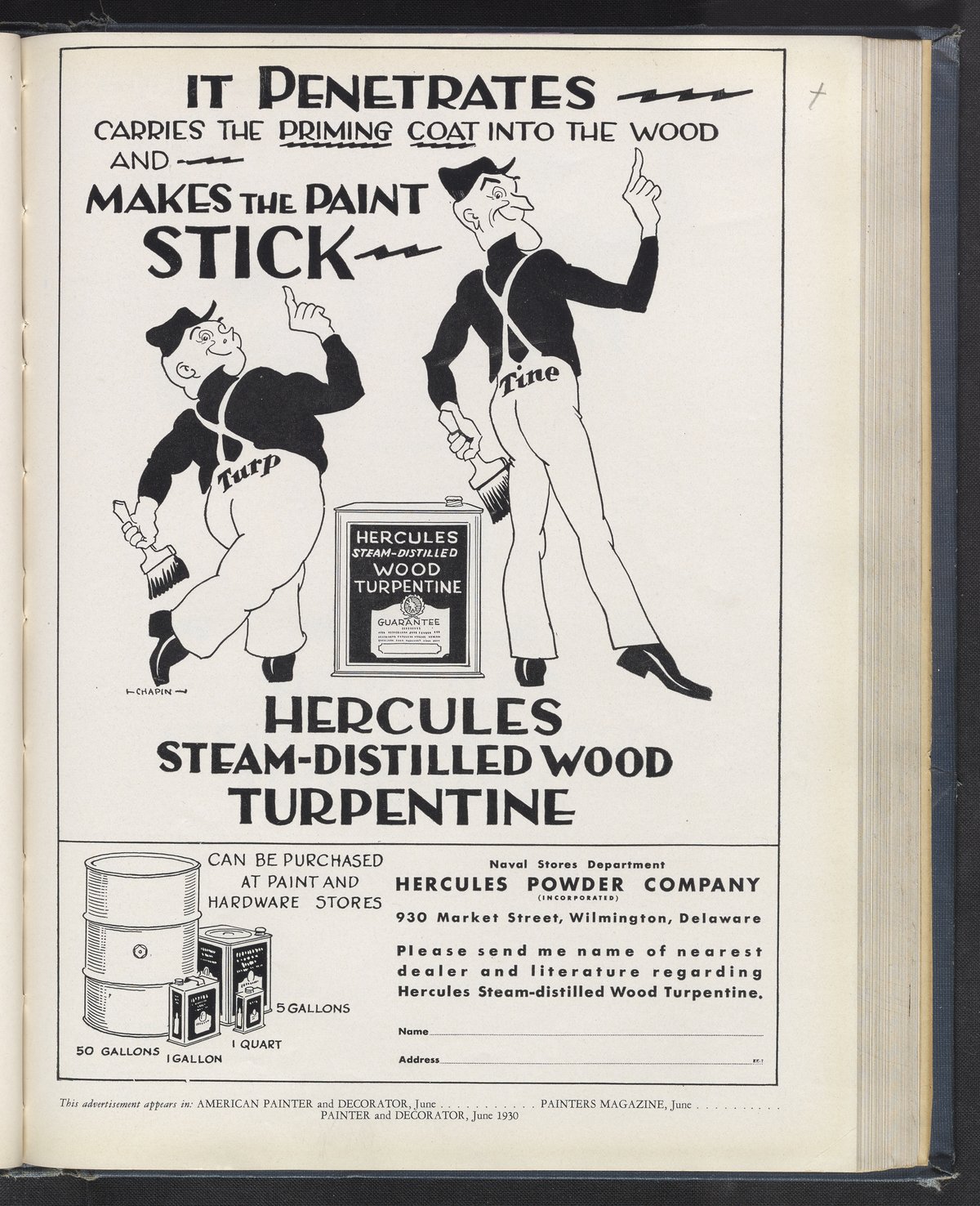Advertisement for steam-distilled wood turpentine manufactured and sold by the Hercules Powder Company, with illustration of brand mascots 'Turp and 'Tine. Formed in 1912 as part of an anti-trust settlement with DuPont, the Hercules Powder Company (later Hercules Inc.) initially specialized in the manufacture of explosives and smokeless powders and subsequently diversified its business to encompass a variety of industrial products, including pine and paper chemicals, synthetics, pigments, polymers, and cellulose.