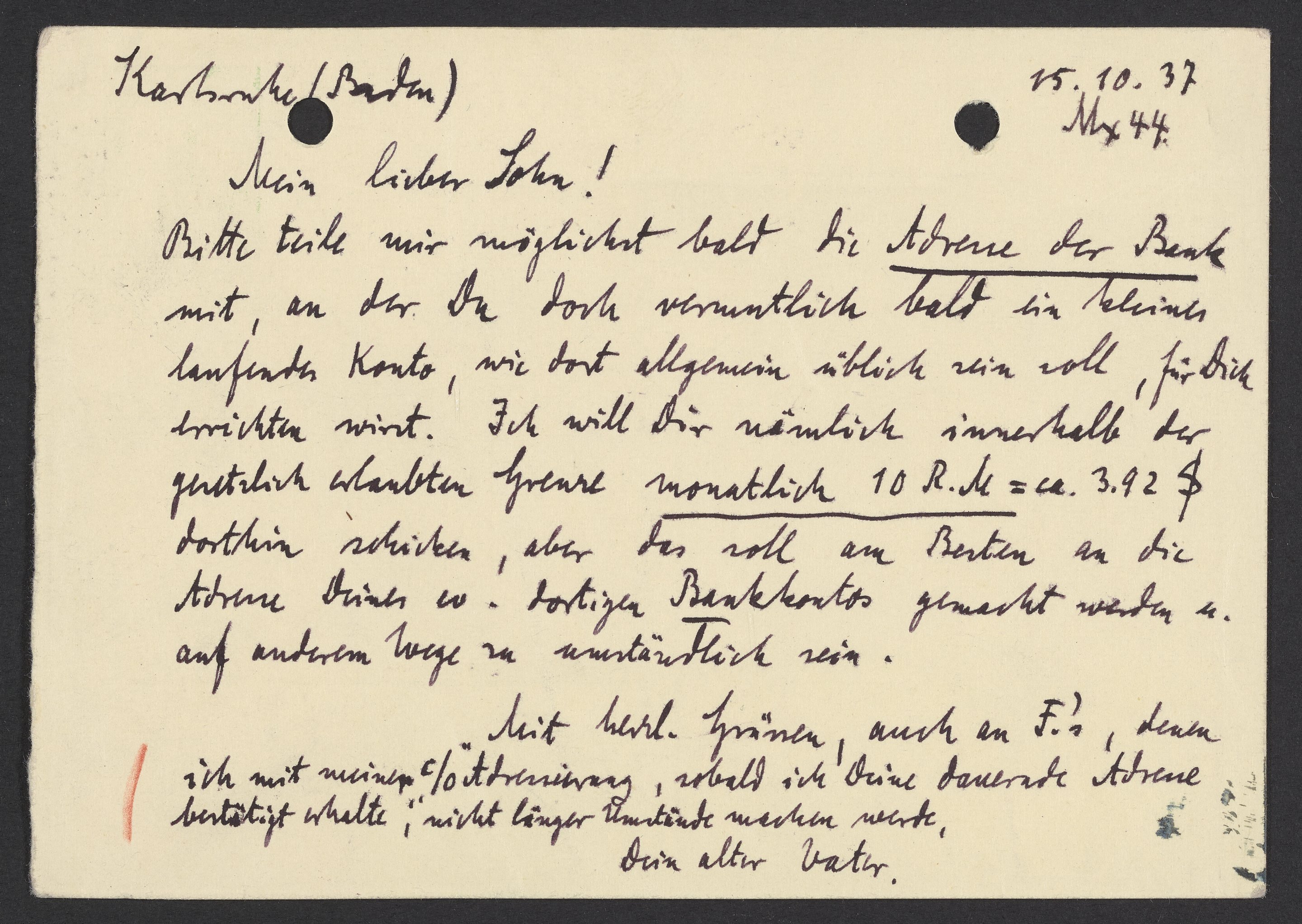 Bitte teile mir möglichst bald die Adresse der Bank mit, an der Du doch vermutlich ein kleines Baufonds Konto, wie dort allgemein üblich sein soll, für Dich errichten wirst. Ich will Dir nämlich innerhalb der gesetzlich erlaubten Grenze monatlich 10 R.M. = ca. 3.92$ dorthin schicken, aber das soll am Besten an die Adresse Deines dortigen Bankkontos gemacht werden u. auf anderem Wege zu umständlich sein.