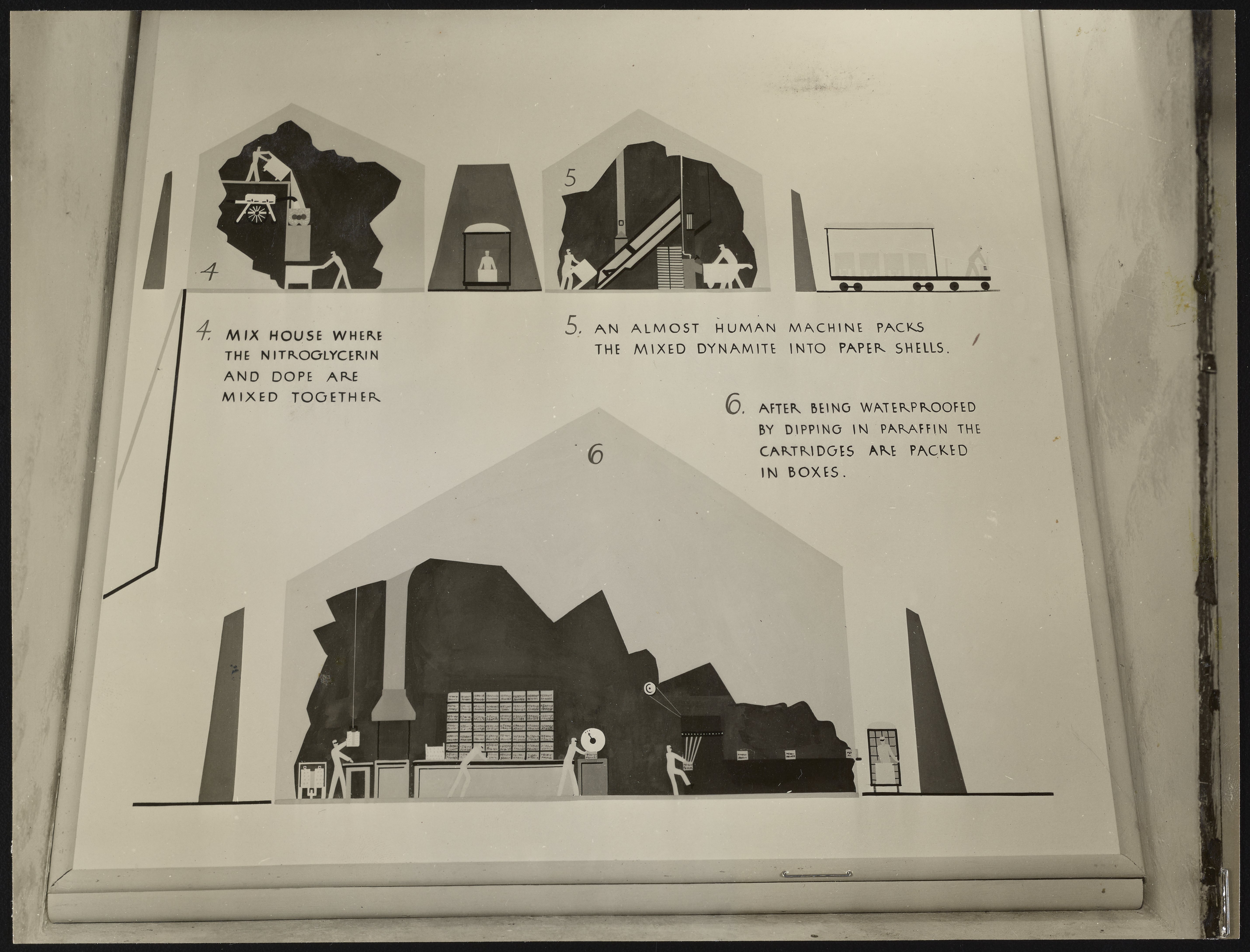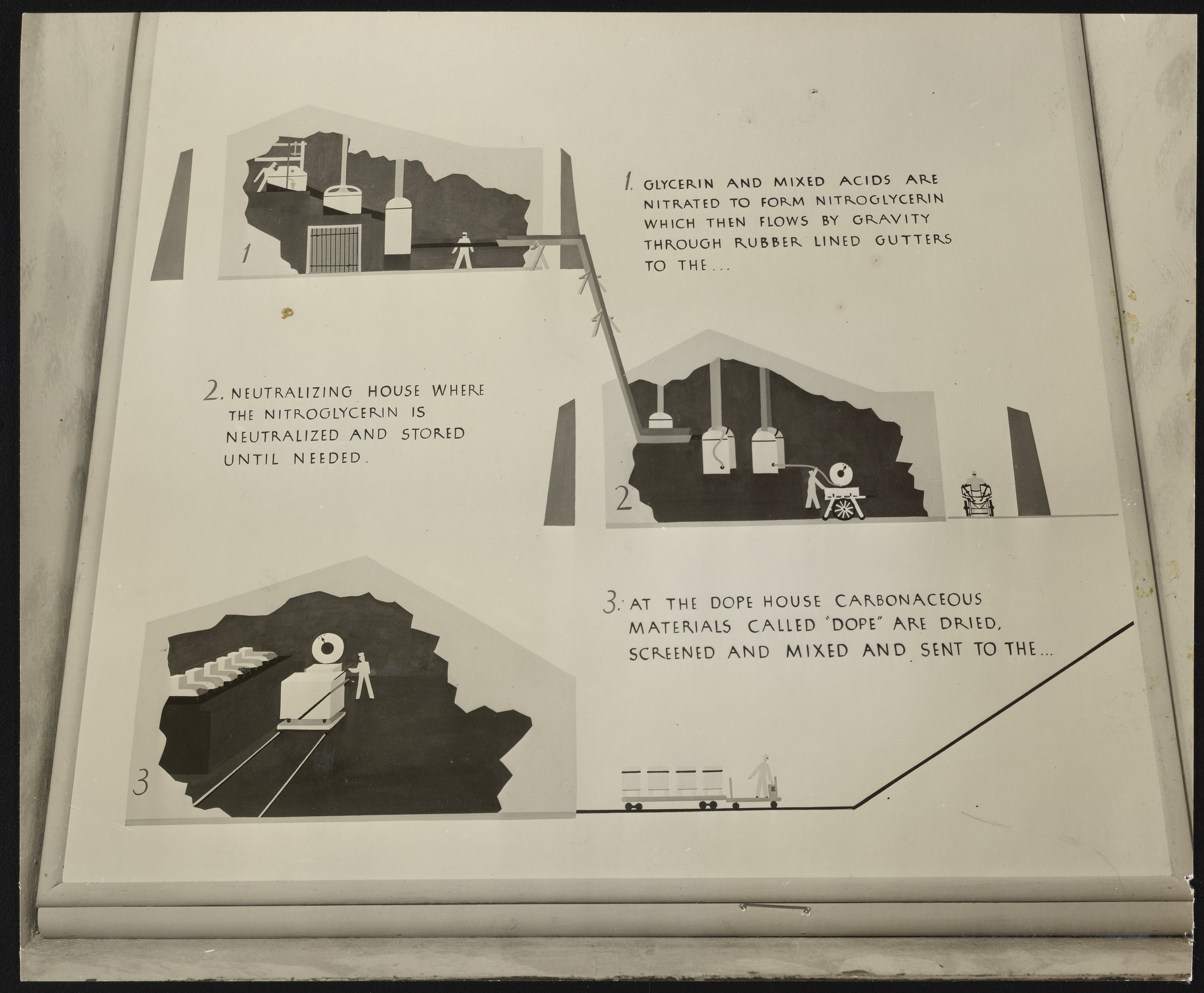 Small JPG1200 x 989px — 133 KBLarge JPG2880 x 2375px — 611 KBFull-sized JPG5523 x 4554px — 1.9 MBOriginal fileTIFF — 5523 x 4554px — 72.0 MBTwo photographs of exhibit panels depicting steps in the processing, manufacture, and packaging of explosives sold by the Hercules Powder Company.