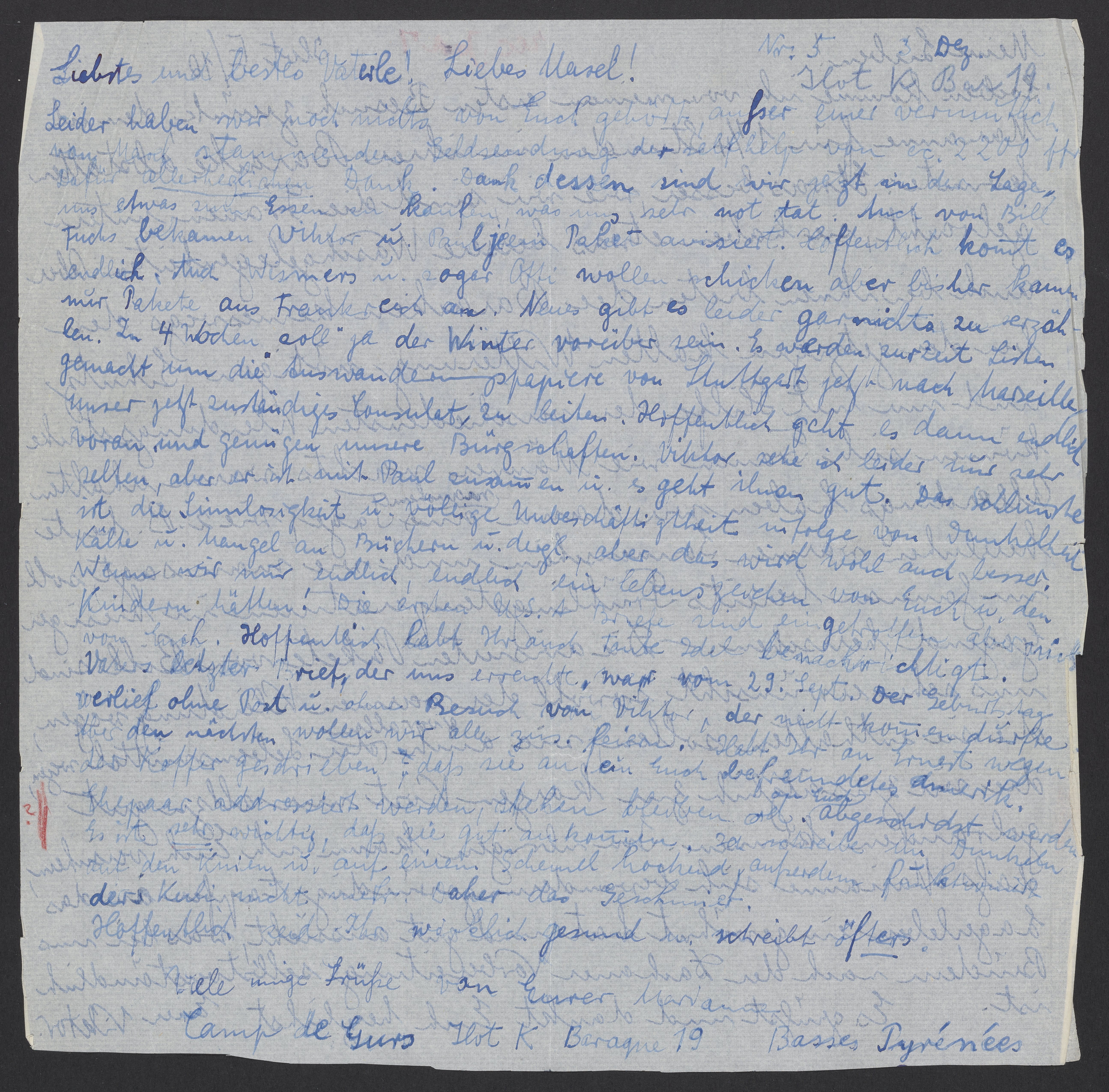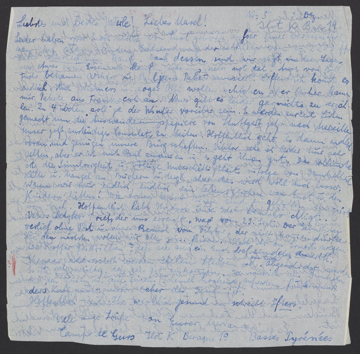 Small JPG1200 x 1190px — 345 KBLarge JPG2880 x 2855px — 1.8 MBFull-sized JPG5180 x 5135px — 5.2 MBOriginal fileTIFF — 5180 x 5135px — 76.2 MBViktor Homburger (1888-1968) describes the dire circumstances at the Gurs internment camp in late 1941 and visiting his wife, Marianne Homburger (1903-1987). He additionally thanks his family for sending packages through Bill Fuchs, an intermediary in Lisbon, Portugal.