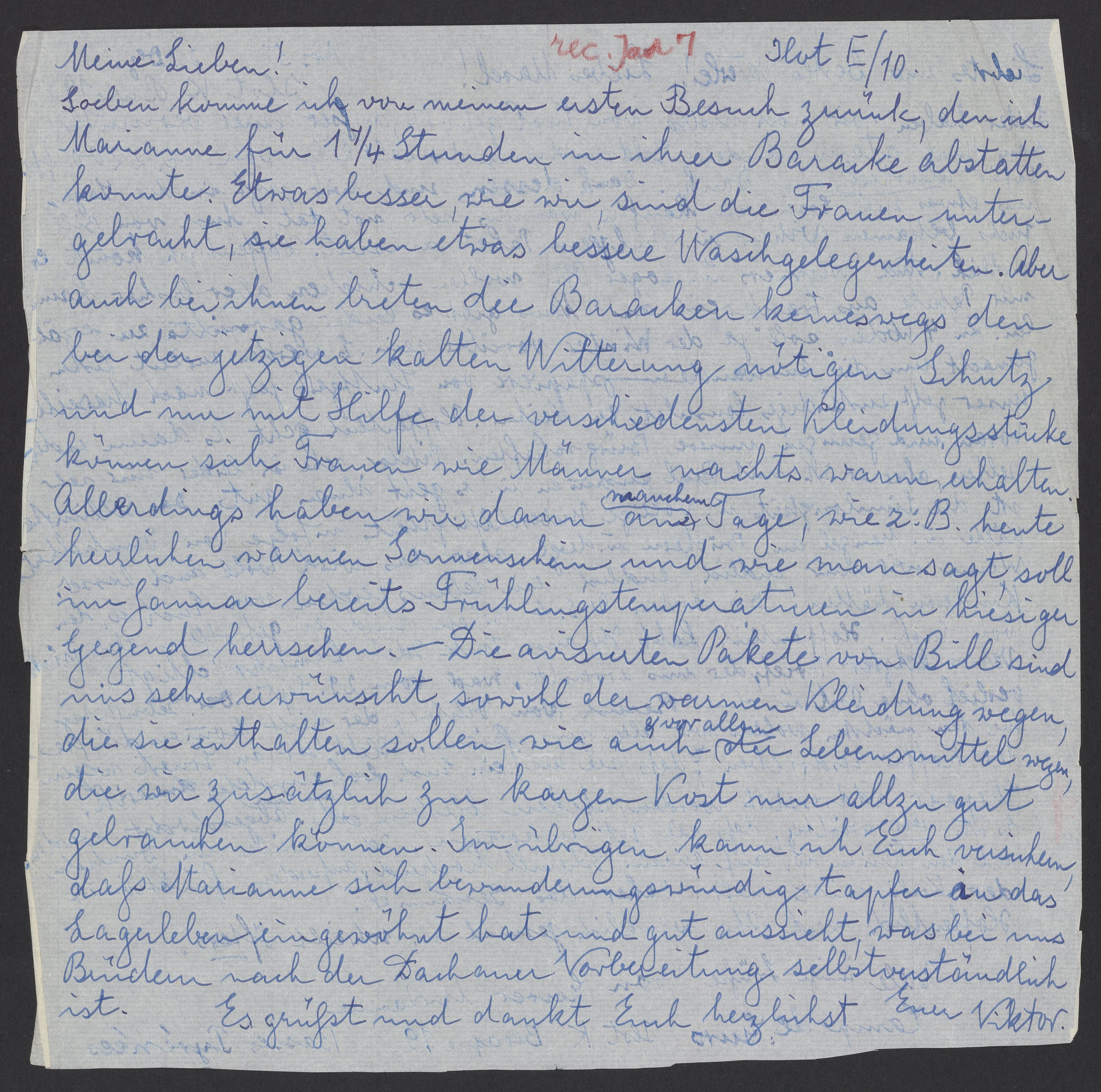 Soeben komme ich von meinem ersten Besuch zurück, den ich Marianne für 1 ¼ Stunden in ihrer Baracke abstatten konnte. Etwas besser, wie wir, sind die Frauen untergebracht, sie haben etwas bessere Waschgelegenheiten. Aber auch bei ihnen breiten die Baracken keineswegs den bei der jetzigen kalten Witterung nötigen Schutz und nur mit Hilfe der verschiedensten Kleidungsstücke können sich Frauen wie Männer nachts warm erhalten. Allerdings haben wir dann manchem am Tage, wie z.B. herzlichen warmen Sonnenschein und wie man sagt, soll im Januar bereits Frühlingstemperaturen in hiesiger Gegend herrschen. – Die avisierten Pakete von Bill sind uns sehr erwünscht, sowohl der warmen Kleidung wegen, die sie enthalten sollen, wie auch vor allem der Lebensmittel wegen, die wir zusätzlich zur kargen Kost nur allzu gut gebrauchen können. Im Übrigen kann ich Euch versichern, dass Marianne sich bewunderungswürdig tapfer in das Lagerleben eingewohnt hat und gut aussieht, was bei uns Brüdern nach der Dachauer Vorbereitung selbstverständlich ist.