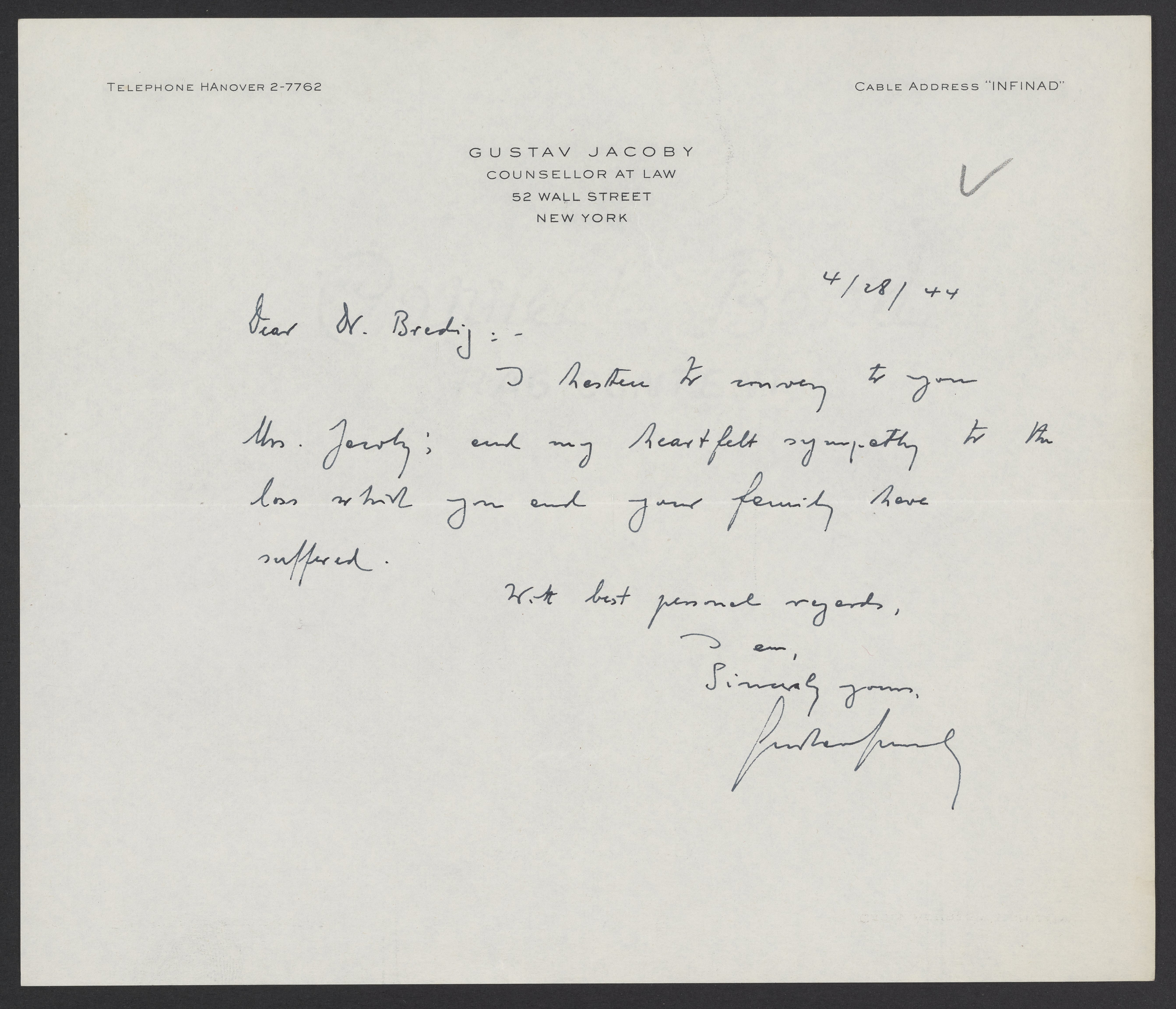Letter of condolence regarding the death of Georg Bredig (1868-1944) from Gustav Jacoby to Max Albert Bredig (1902-1977).