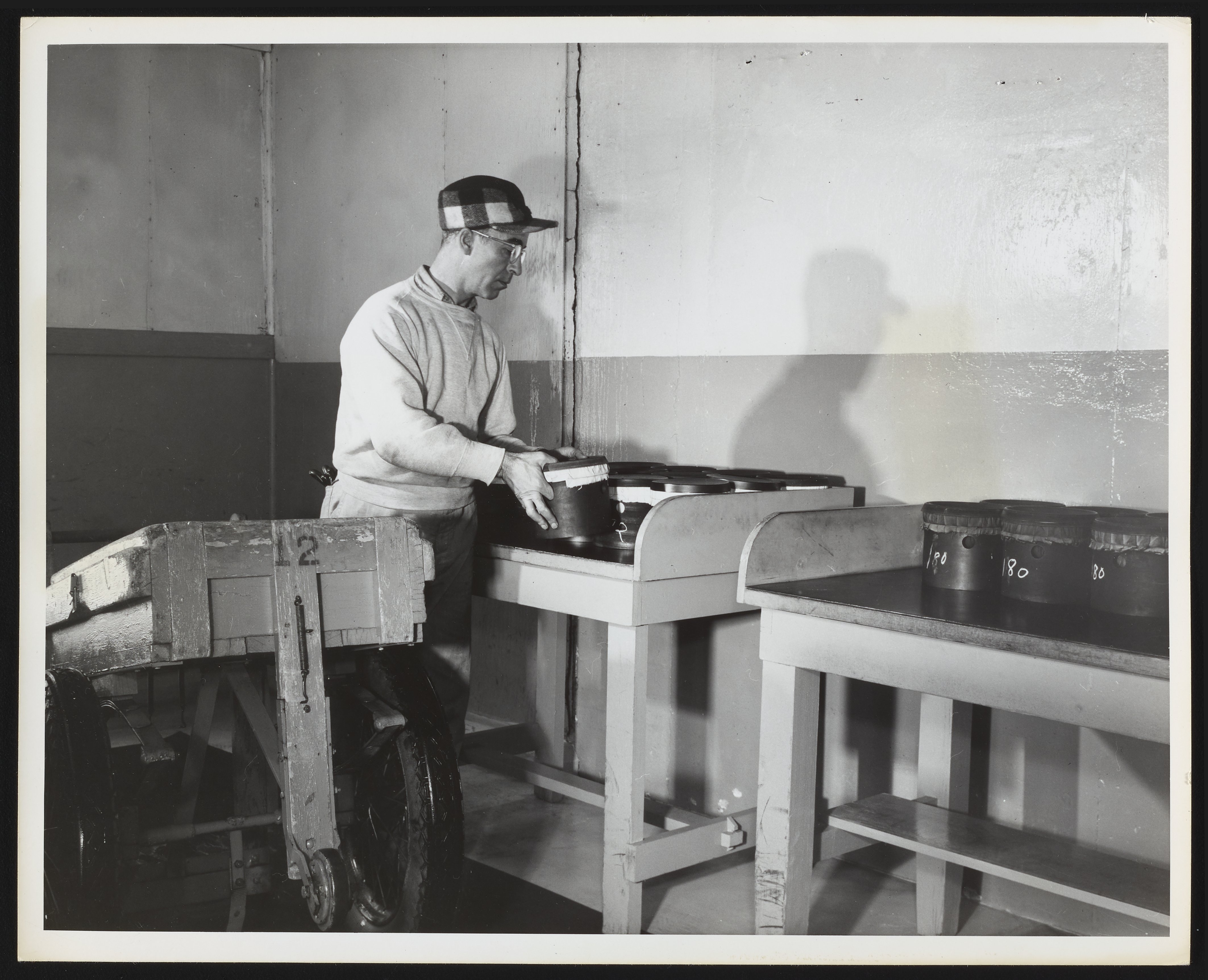 Hercules Incorporated. “James Fiore Transferring Dry Powder at Hercules Port Ewen Plant,” 1954. Photographs from the Records & Ephemera of Hercules Incorporated, Box 2, Folder 37. Science History Institute. Philadelphia. https://digital.sciencehistory.org/works/fb494892v.