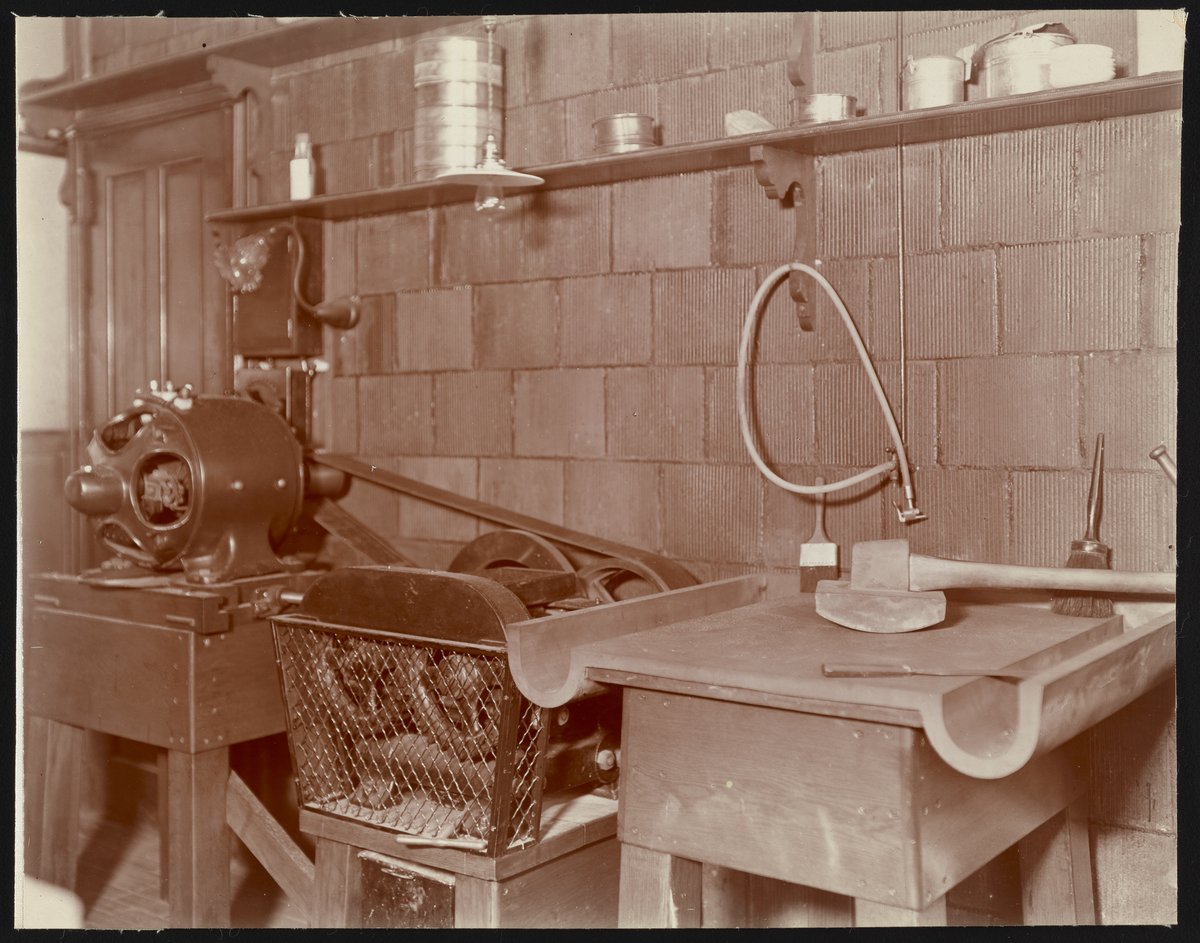 Close-up view of the bucking board and crusher used to prepare coal and ore samples for analysis at the Dearborn Drug and Chemical Works (later Dearborn Chemical Company) 35th Street laboratory facilities located in Chicago, Illinois. Founded in 1887, the Dearborn Chemical Company was a corporate ancestor of BetzDearborn, Incorporated best known for manufacturing water treatment chemicals for use in boilers, cooling towers, and steam locomotives.