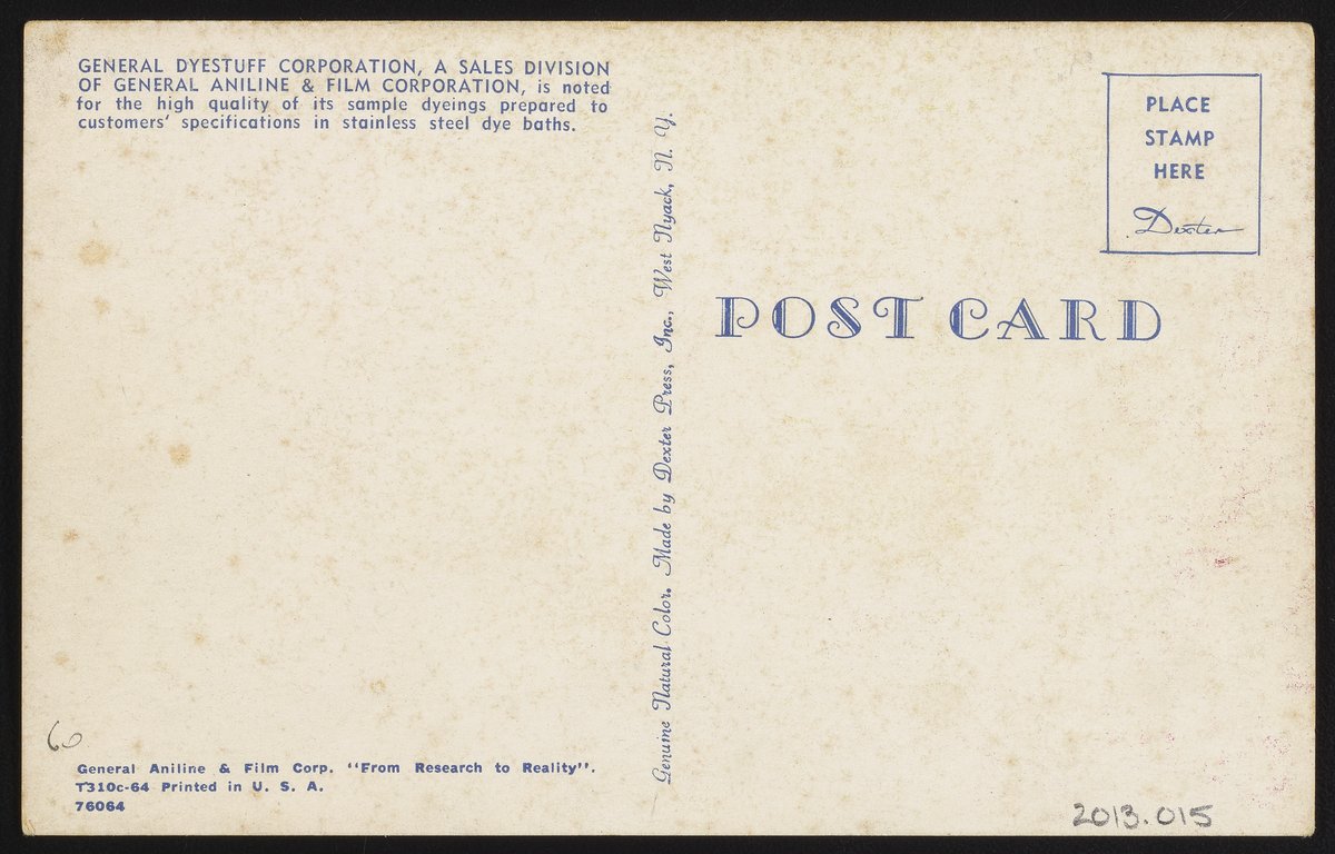 General Aniline & Film Corporation. “Postcard for General Dyestuff Corporation of the General Aniline & Film Corporation with Woman Using Dye Bath.” West Nyack, New York: Inc. Dexter Press, circa 1953. Science History Institute. Philadelphia. https://digital.sciencehistory.org/works/fb494960s.