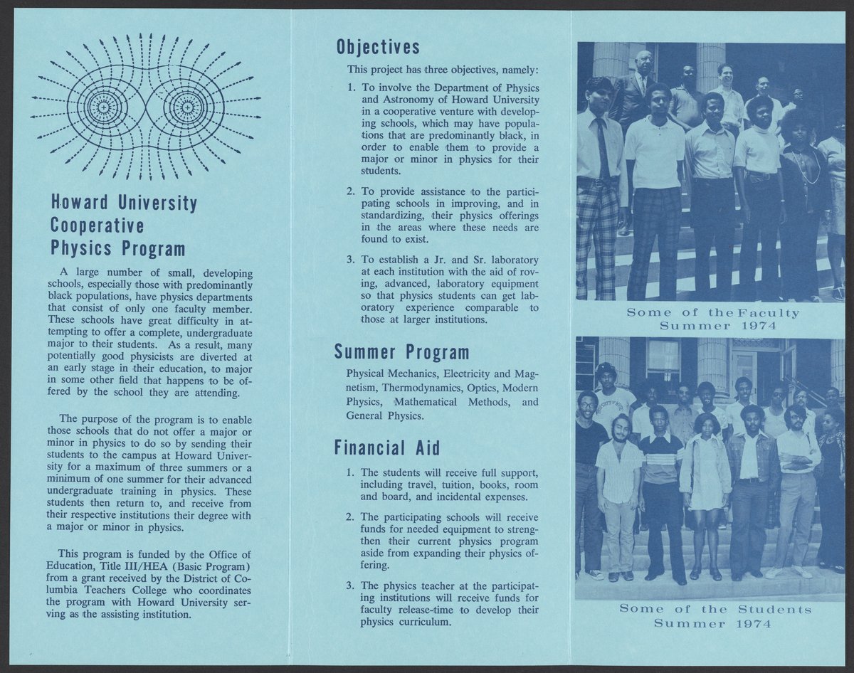 Brochure for Howard University's cooperative physics program for developing institutions, which brought students from colleges and universities that offered no minor or major in physics to Howard University for advanced undergraduate training in physics.