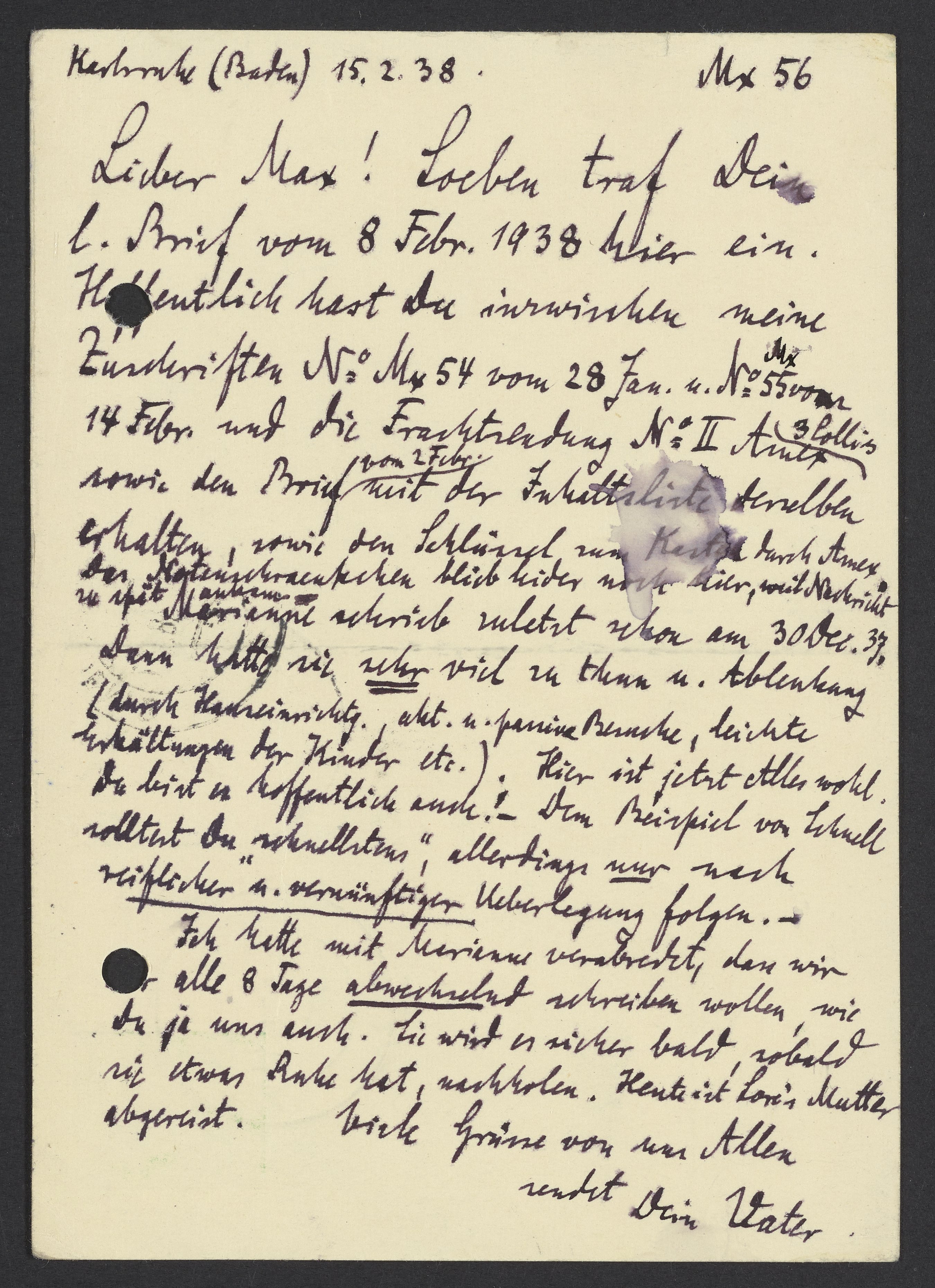 Soeben traf Dein l. Brief vom 8. Febr. 1938 hier ein. Hoffentlich hast Du inzwischen meine Zuschriften No Mx 54 vom 28. Jan. u. No Mx 55 vom 14 Febr. und die Frachtsendung No II Amex 3 Collins sowie den Brief von 2 Febr. mit der Inhaltsliste derselben erhalten, sowie den Schlüssel zum Kasten durch Amex. Der Notenschrakchen blieb leider noch nur, weil Nachricht zu spät ankam.