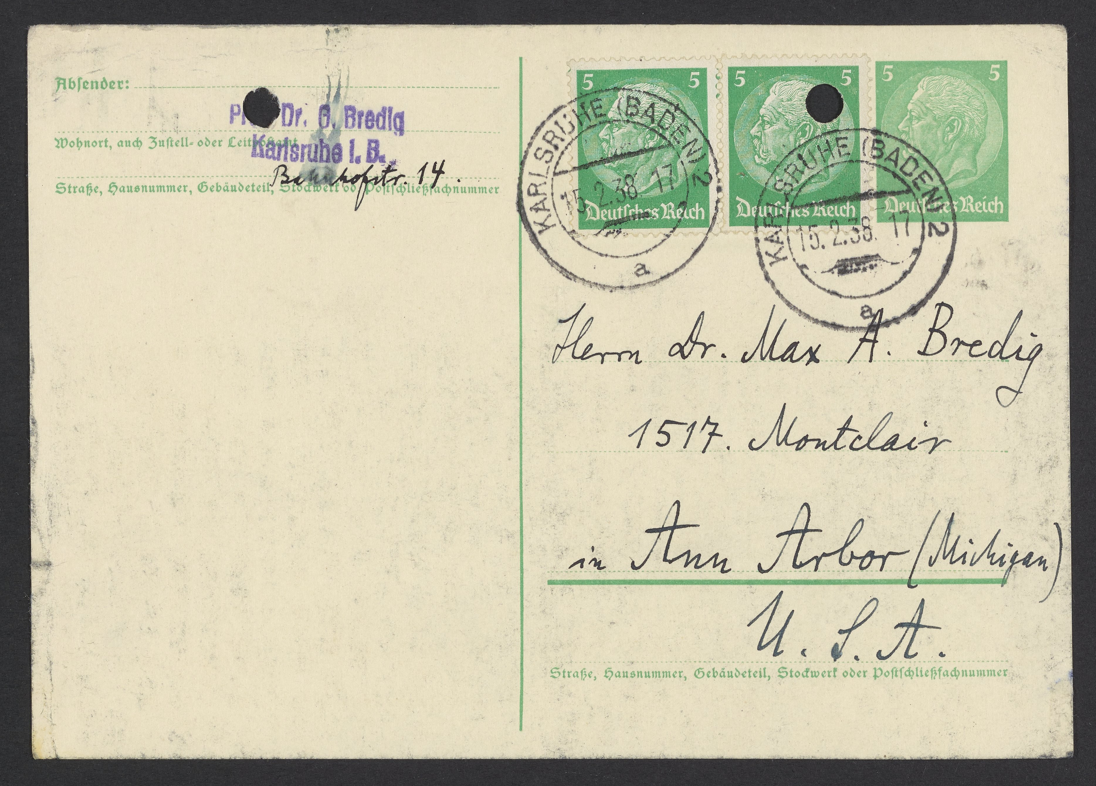 Bredig, Georg. “Postcard from Georg Bredig to Max Bredig, February 15, 1938,” February 15, 1938. Papers of Georg and Max Bredig, Box 7, Folder 13. Science History Institute. Philadelphia. https://digital.sciencehistory.org/works/fbhg1r9.