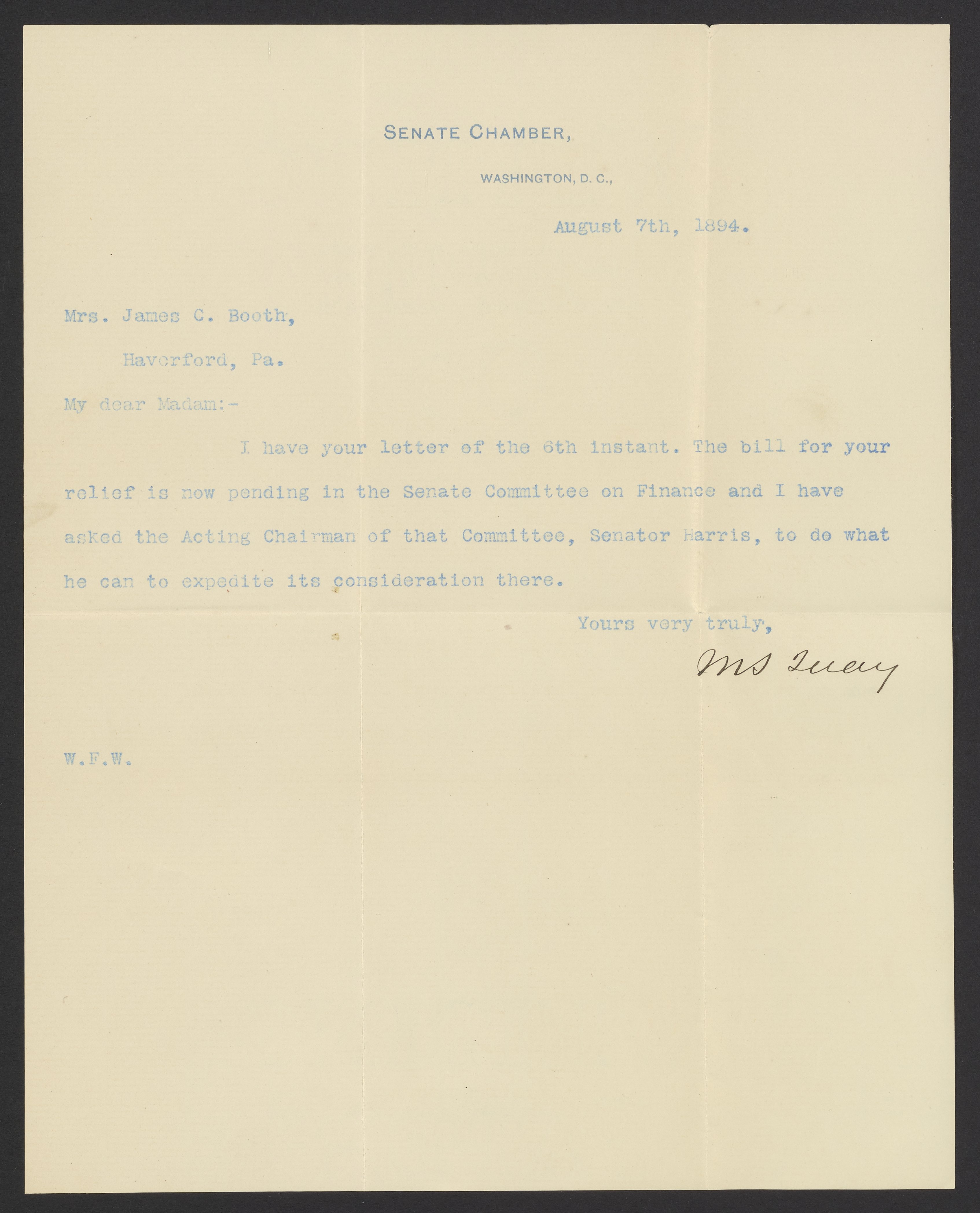 Matthew S. Quay (1833-1904) of the United States Senate writes to inform Margaret M. Booth née Cardeza that the bill for her relief is now pending and Acting Chairman of the Senate Committee on Finance, Senator Harris, will expedite its consideration.