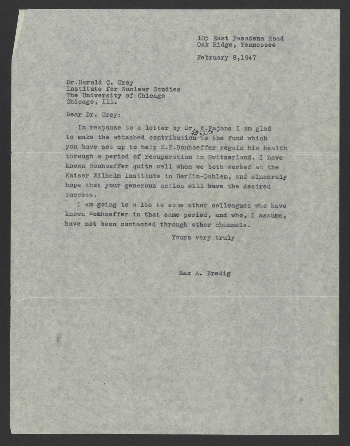 Max Bredig (1902-1977) contributes $25.00 to help Karl Friedrich Bonhoeffer (1899-1957) recover from angina pectoris (chest pain). Bredig tells Harold C. Urey (1893-1981) that he will write to other colleagues who know Bonhoeffer in hopes they will help as well.
