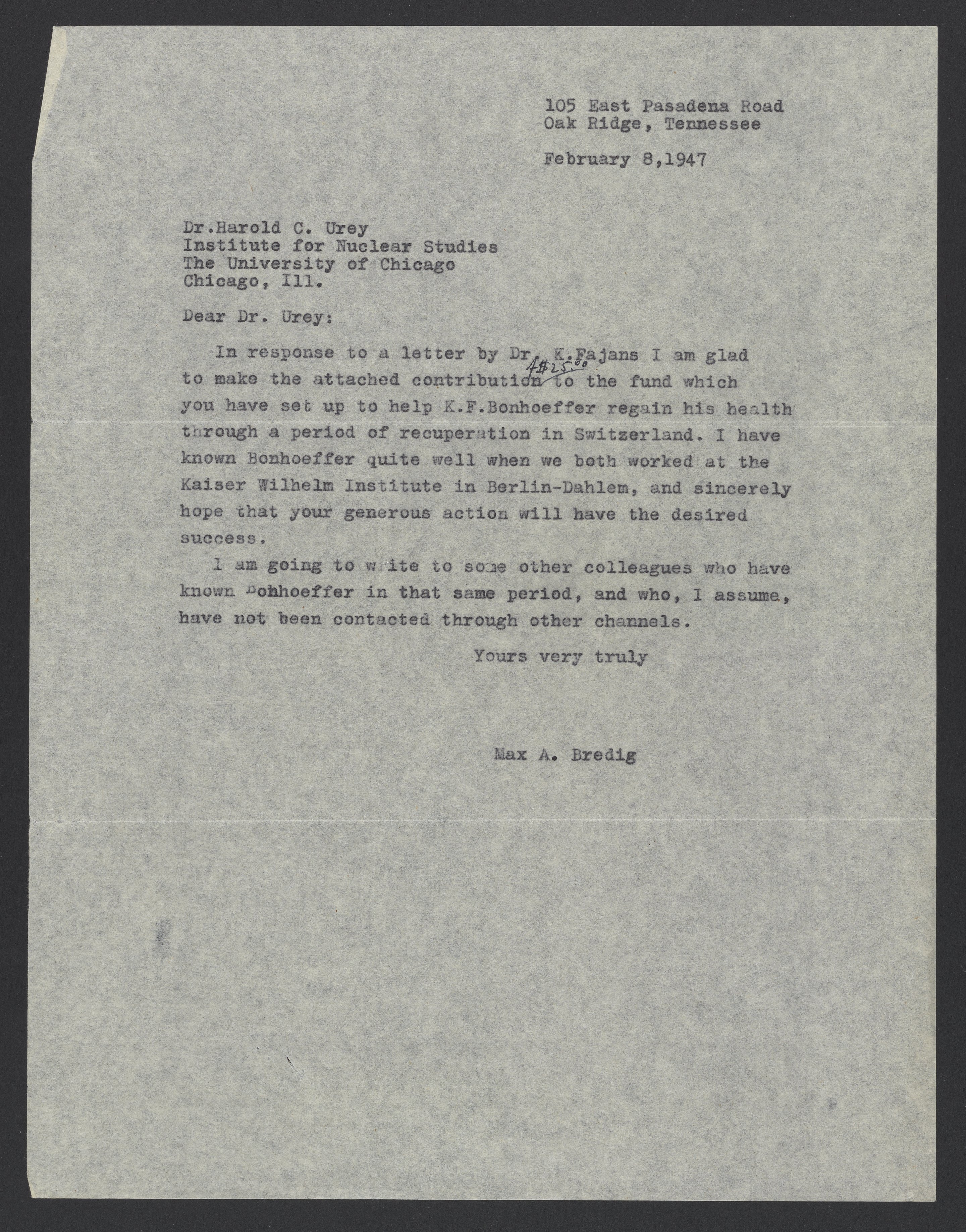 Max Bredig (1902-1977) contributes $25.00 to help Karl Friedrich Bonhoeffer (1899-1957) recover from angina pectoris (chest pain). Bredig tells Harold C. Urey (1893-1981) that he will write to other colleagues who know Bonhoeffer in hopes they will help as well.