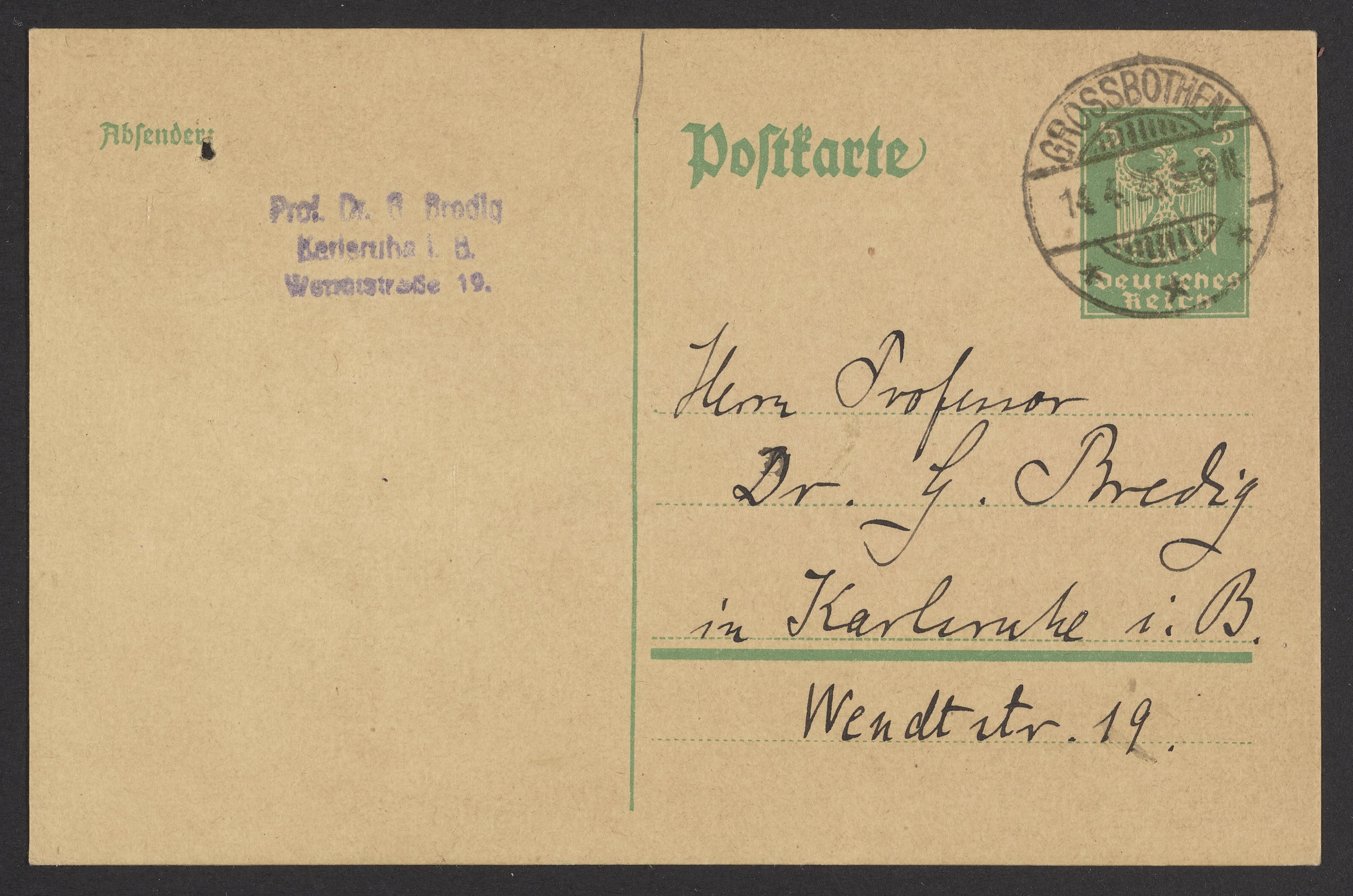 Postcard from Wilhelm Ostwald to Georg Bredig, April 1925