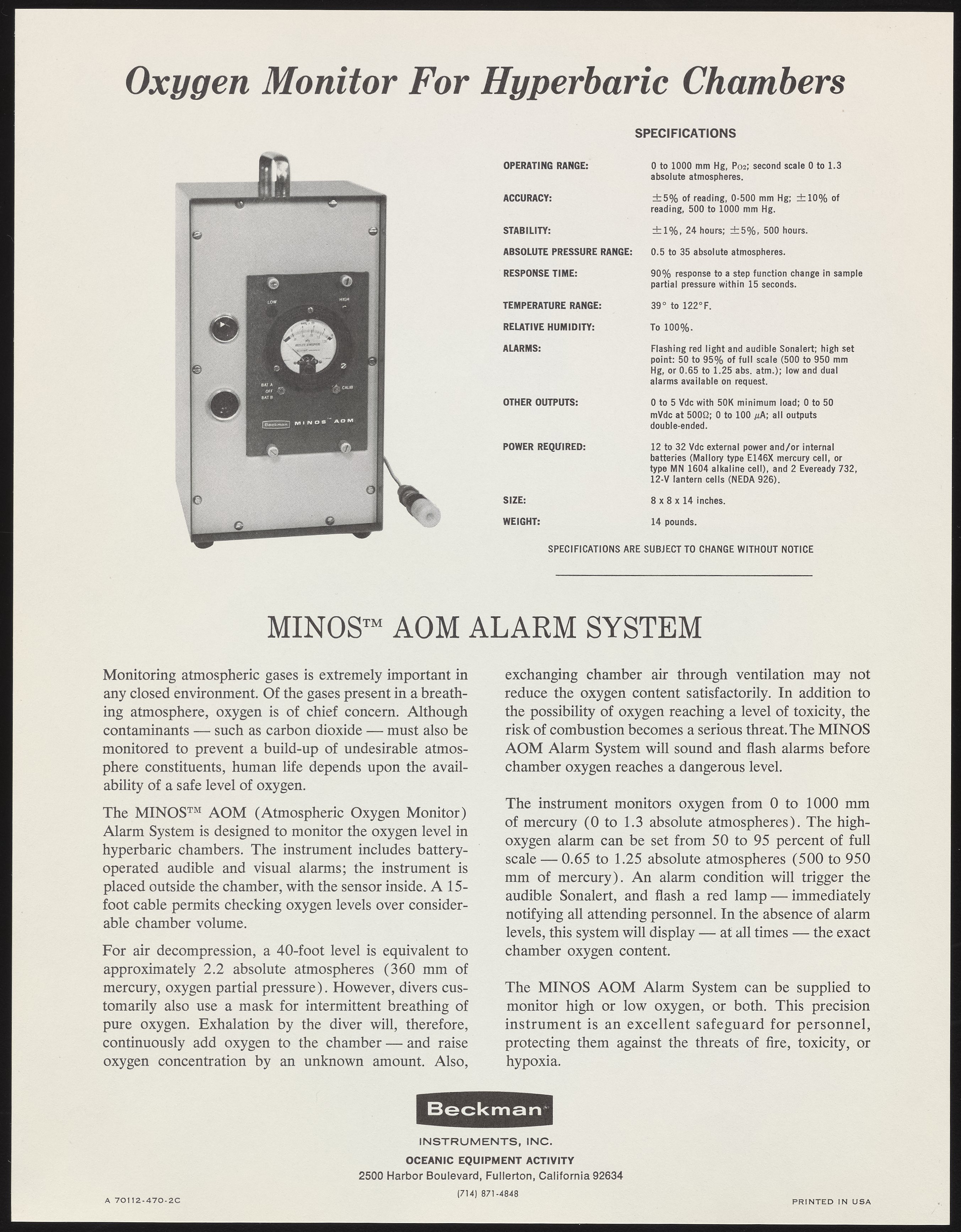 Beckman Instruments, Inc. “Oxygen Monitor for Hyperbaric Chambers,” circa 1969. Beckman Historical Collection, Box 58, Folder 9. Science History Institute. Philadelphia. https://digital.sciencehistory.org/works/ff365526h.